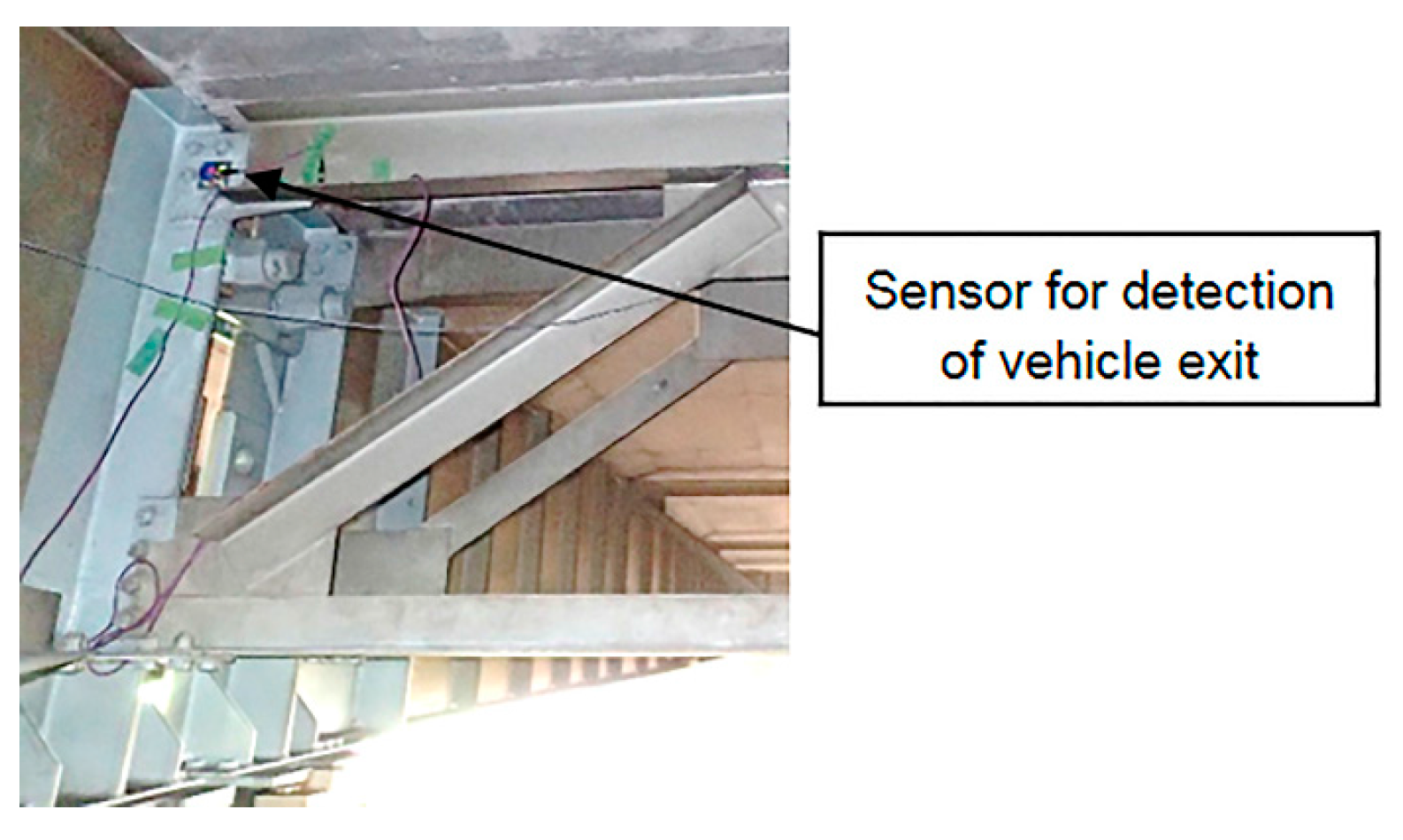 To detect vehicle entry and exit, instead of applying the conventional method using a strain gauge [23], the acceleration was measured using accelerometers at the vertical stiffeners on both longitudinal edges of the main girder. The specifications of the accelerometers are listed in Table 3. The sampling frequency for vehicle detection was 500 Hz. The experimental setup for the accelerometer used to detect vehicle exit is shown in Figure 10. Figure 11 shows the acceleration record and the displacements measured using the contact displacement gauge. The acceleration record revealed the passage of one vehicle with two axles and another vehicle with five axles. Because the passing times of the two vehicles (1.72 and 1.74 s) were different, the results indicated that two vehicles were passing over the bridge. Furthermore, because the distances between the peaks in the acceleration record at the entry and exit sides were equal, it was concluded that the two vehicles passed over at constant speeds. Because the length of the test bridge is 34.55 m, the vehicle speeds, which were 72.3 and 71.5 km/h for the two- and five-axle vehicles, respectively, could be estimated. The entry time and the exit time for the two-axle vehicle (3581.11 s, 3583.04 s) and the entry time and the exit time for the five-axle vehicle (3581.37 s, 3583.73 s) are indicated in Figure 11.
