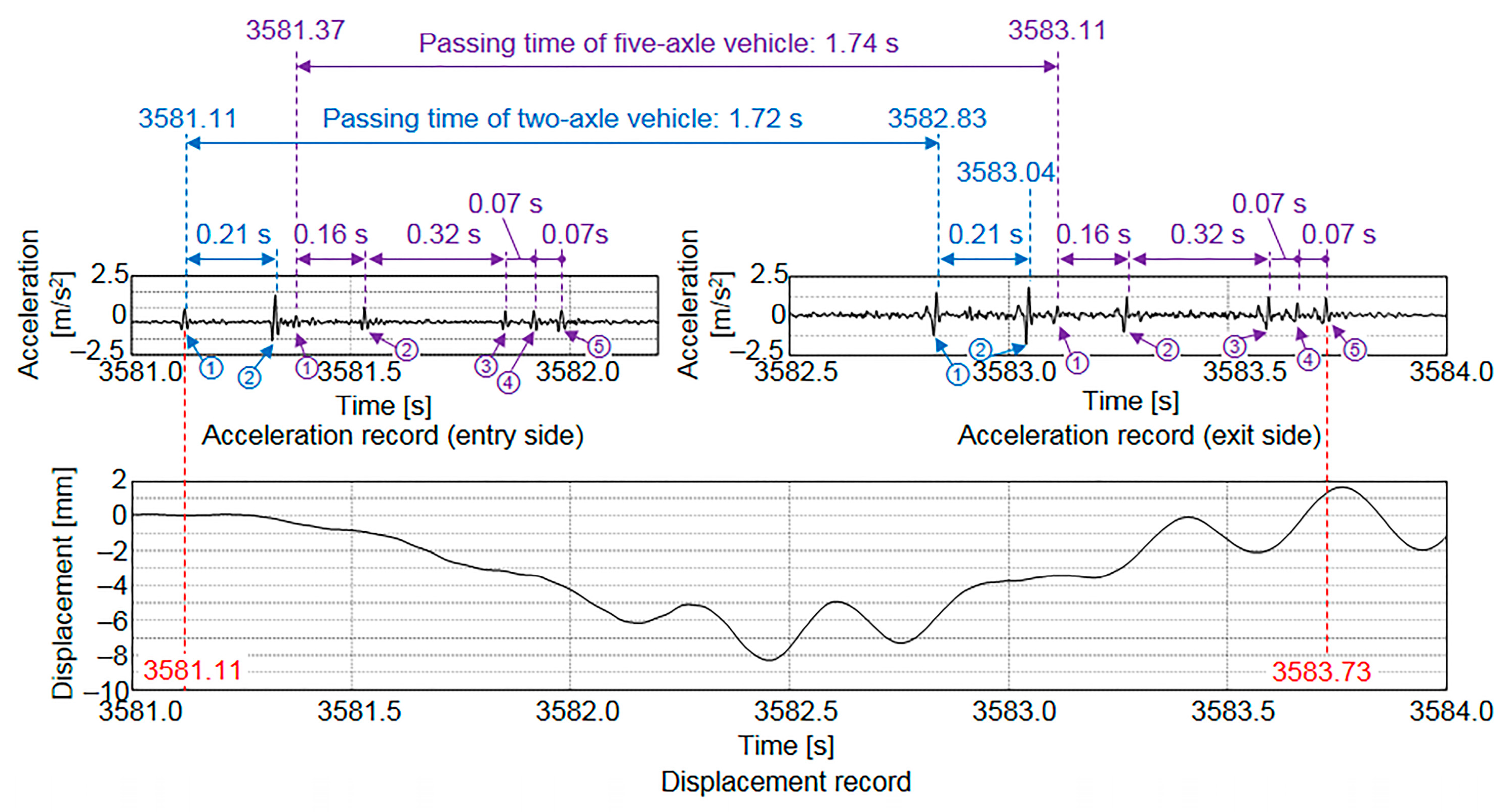 - To apply the proposed method, the vehicle entry and exit times must be detected. In this study, this was achieved using the acceleration measured at a vertical stiffener of the main girder. Furthermore, using the distance between peaks in the acceleration record, the fact that multiple vehicles were passing over the bridge was able to be determined. In addition, using the distance between peaks in the acceleration record, the speeds of the vehicles were able to be estimated.