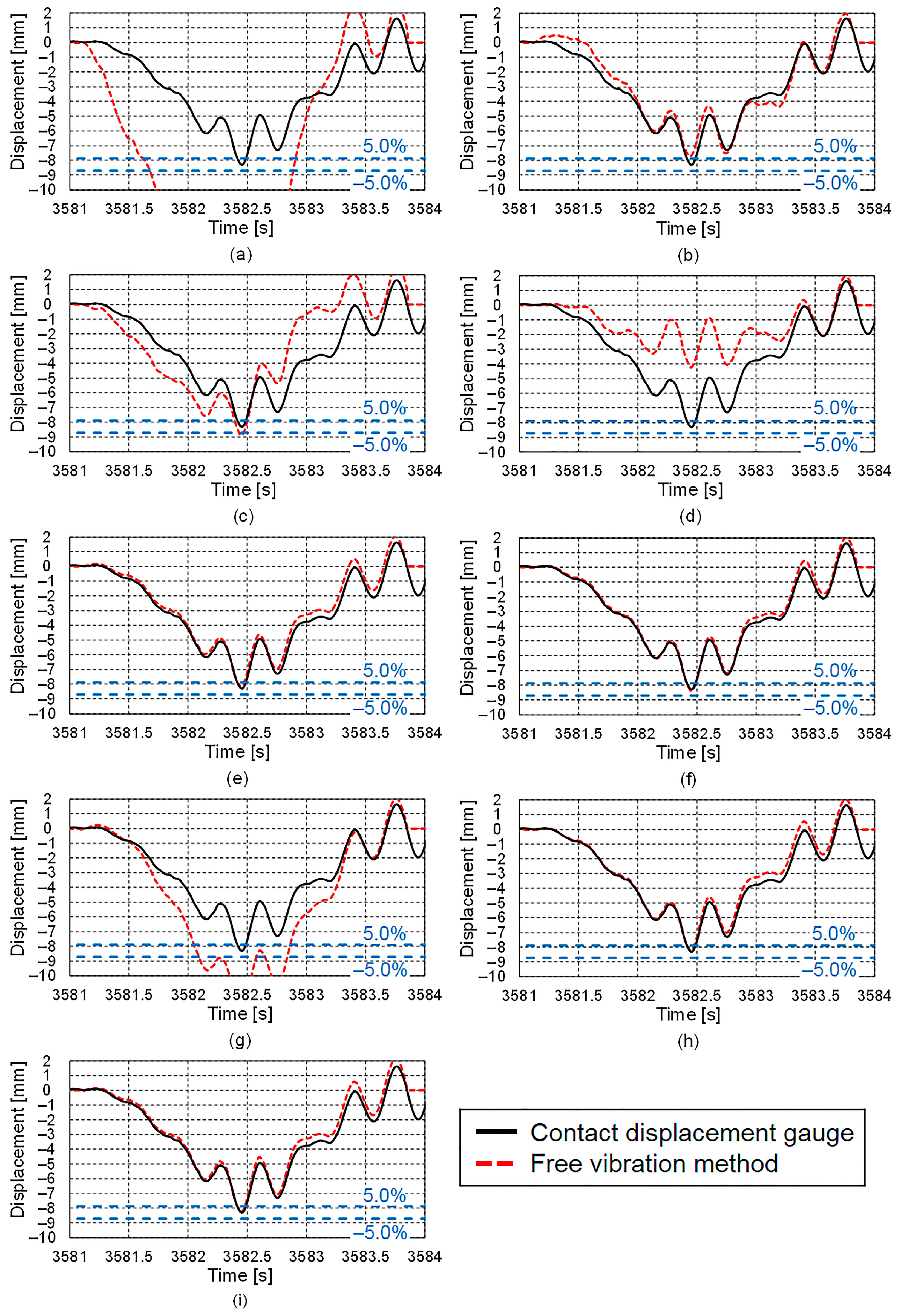 4.2. Displacement Results Obtained Using Proposed Free Vibration Separation Method at Longitudinal Center