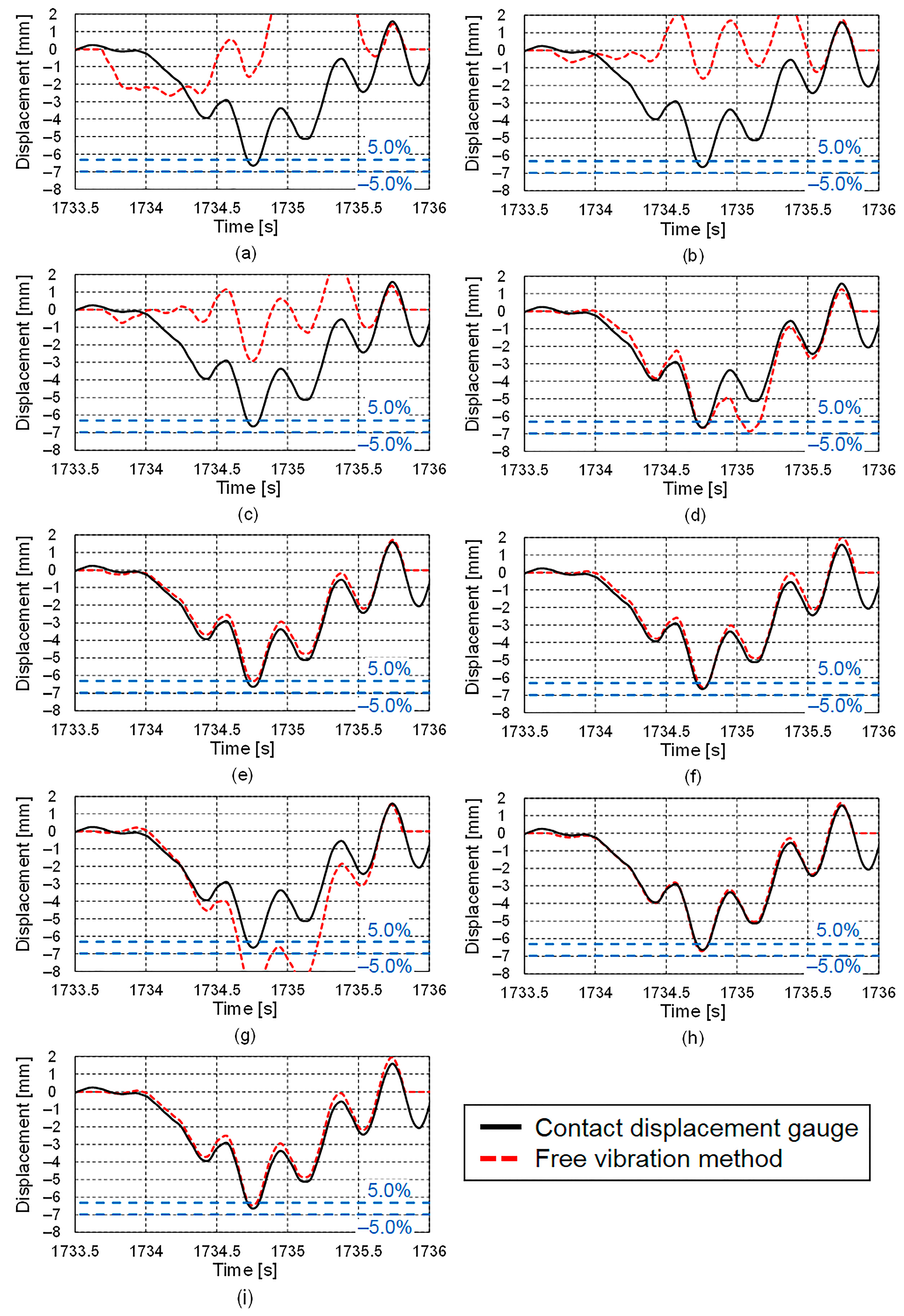 Displacement responses obtained using proposed free vibration separation method: (a) Accelerometer A; (b) Accelerometer B; (c) Accelerometer C; (d) Accelerometer D; (e) Accelerometer E; (f) Accelerometer F; (g) Accelerometer G; (h) Accelerometer H; (i) Servo-type accelerometer.