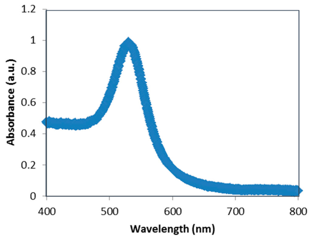 The absorption spectrum of the solution containing the dispersed GNPs (Figure 1) was observed through a UV-VIS-NIR spectrophotometer AVASPE-2048 Avantes. Surface plasmon resonance (SPR) causes strong scattering as well as absorption of light. Therefore, the absorption spectrum of dispersed GNPs provides data about the SPR band of GNPs. Our observations show that SPR band of the GNPs used for this work ranges from 400 nm to 600 nm, with a peak at 525 nm (Figure 1).