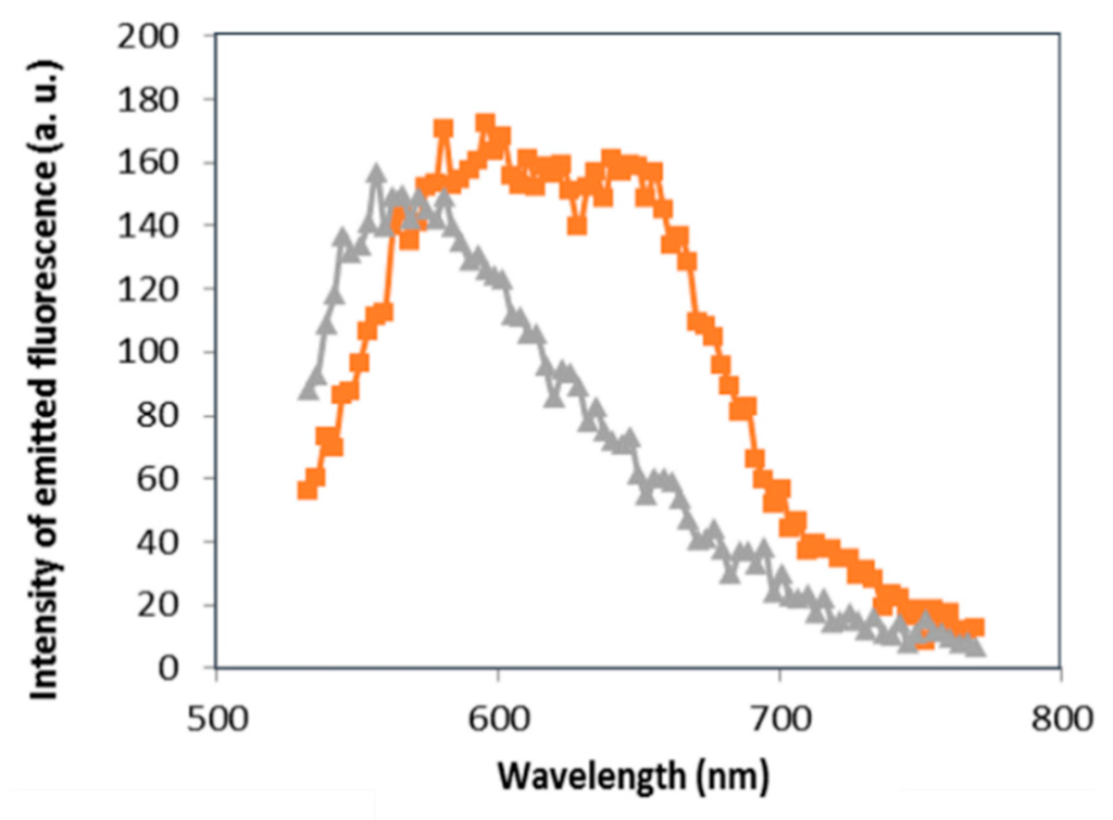 The evaporation of the coated films prepared from the solutions No. 1 and 2 induced, respectively, a precipitation of aggregated cationic surfactants complexes with and without GNPs. Before the drying of the coated film (solution No. 2), NB as hydrophobic probe moves closely to the hydrophobic part of cationic surfactants [17]. As depicted in Figure 3, the fluorescence spectra of the untreated GNPs precipitation recorded with the lambda scan mode across the (530–775) nm range under an excitation of 514 nm shows a maximum at the wavelength of 565.59 nm (grey curve, Figure 3). Under the same excitation, the fluorescence spectra of treated GNPs precipitation recorded with the lambda scan mode across the same range is broadened and slightly redshifted compared to the fluorescence spectra in the absence of GNPs (orange curve, Figure 3). For the sample treated with GNPs, the evaporation of the solution induced their aggregation which was expected since that the dipole-dipole interaction between these nanoparticles is stronger when the distance between them decreases. The SPR of GNPs presents a broadening and red shift when they aggregate [22]. Moreover, it seems that NB entrapment inside the hydrophobic part of the bilayer polymeric film covering aggregated GNPs is responsible of a FRET between NB (acceptor) and aggregated GNPs (donor) which explains the fluorescence enhancement in the (565.59–706.59) nm range (Figure 3). When a fluorophore is quite close to a plasmonic particle, for instance within 10 nm, the electrons of the fluorophore are influenced by the plasmon field changing their excitation/emission properties. The interaction results in a quenching or enhancement of the fluorescence [23,24], which improves the performance of the optical response of the fluorescent contrast agents [25,26,27].