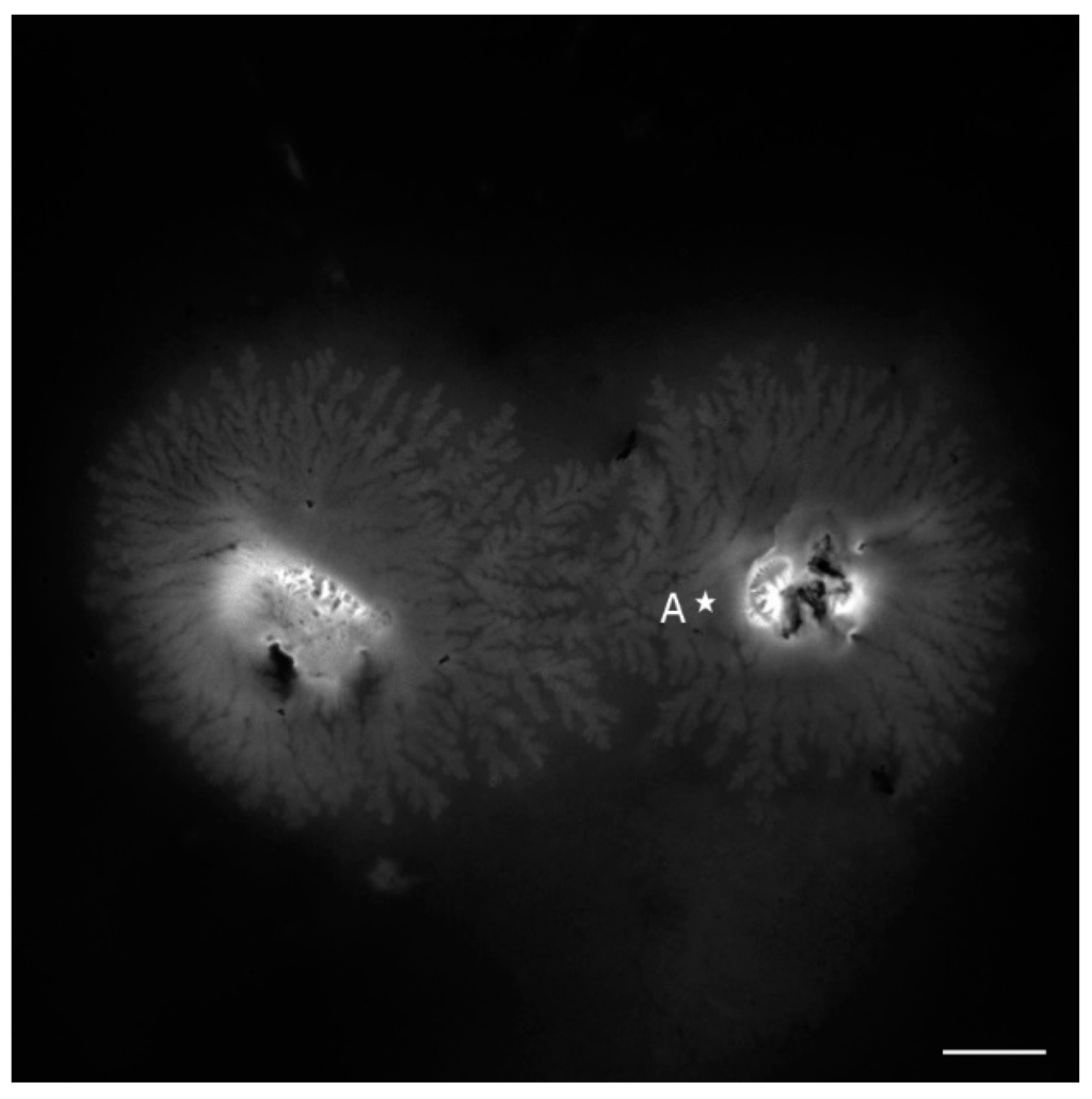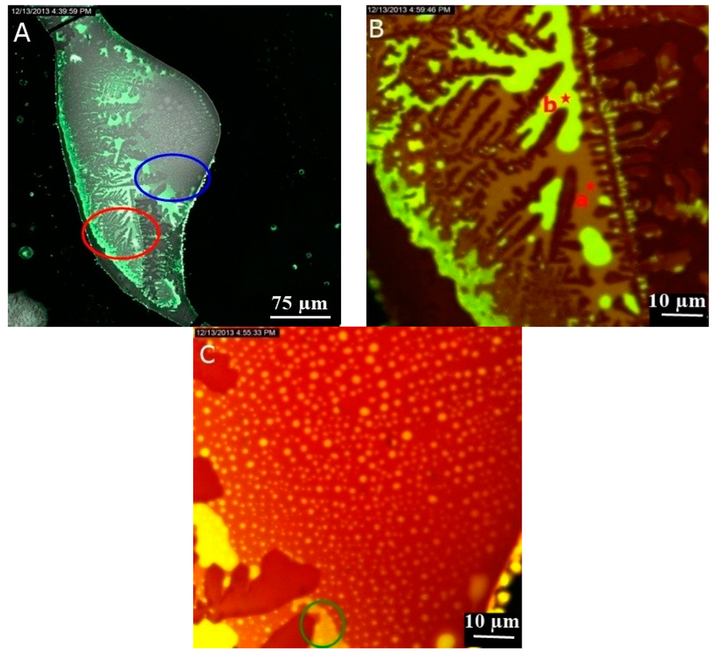 As the DNA is concentrated (>1 mg/mL; solution No. 3), the molecules were precipitated into a liquid crystalline phase after the drying of the solution deposited via drop-coating on the glass slide [28]. Figure 4 shows emitted fluorescence from NB bound to DNA molecules organized into the flower like texture which is a highly ordered liquid crystalline form of DNA [29], detected in the (550–750) nm range under the wavelength of 514 nm. As depicted in Figure 5, the fluorescence spectra of NB bound to DNA molecules organized into liquid crystalline phase recorded with lambda scan mode from point marked as A is redshifted compared to the fluorescence spectral of NB bound to cationic surfactants complexes (Figure 3). This shift is explained by the sensitivity of NB to the polarity of the environment. The hydrophobic part of cationic surfactants, where NB is placed is non-polar, whereas in the case of DNA stained with NB, there is an amount of this probe which is bound to the polar negatively-charged phosphate backbone.