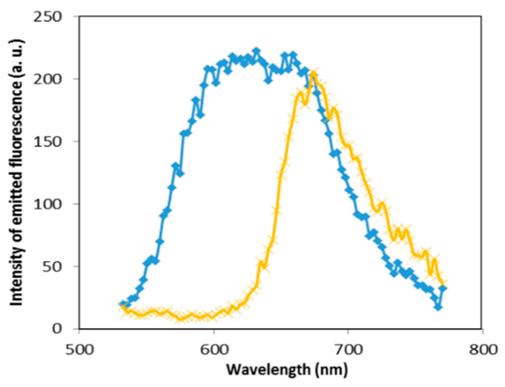 Fluorescence spectra of NB bound to precipitated DNA in the absence (yellow) and in the presence (blue) of GNPs aggregation recorded with lambda scan mode in respectively points marked as a and b in Figure 6B. The emission is obtained under an excitation of 514 nm and it is detected in the (530–775) nm range.
