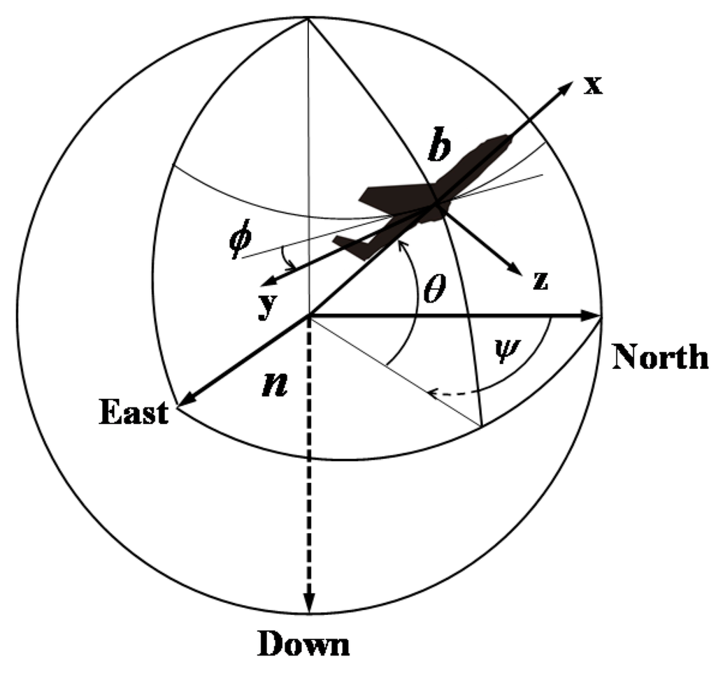 where represents the direction cosine matrix (DCM) used to transform the measured quantities from the frame b into the frame n. Henceforward, the parameter t will be omitted for the convenience of readers. can be carried out through three different separate rotations about the three axes. , , and represent the rotation angle about the -axis, angle about the -axis, and angle about the -axis, respectively, which are defined as: