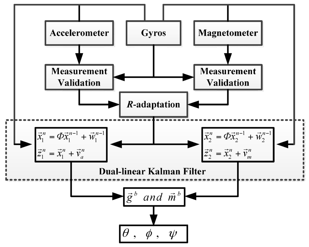 Nowadays, typical MEMS-based orientation systems usually consist of three single-axis gyros and an electronic compass which includes a tri-axis accelerometer and a tri-axis magnetometer [15,16,17]. It is crucial to develop appropriative embedded data fusion solutions for the orientation systems. The Kalman filter (KF) has already become the most commonly used sensor fusion technique for MEMS orientation systems. Various filter models were developed for different orientation representations, such as the direction cosine matrix, Euler angles, and quaternion. To simplify the implementation of KF, Zhu, et al. developed a linear KF in which the state vector was composed of the gravity and geomagnetic field in body frame [18]. A linear Kalman model was designed and the effect of the forgetting factor on the time lag was also investigated in their paper. Han and Wang proposed an Euler angle errors-based method to express errors in the local level frame rather than the body frame so as to achieve a linear KF [19]. Though the nonlinearity problem was avoided, the observation model was still faced with the singularity problem in their approach when the pitch angle gets through the area near ±π/2. Li and Wang developed an improved linear KF based on the psi-angle propagation equation [20]. The residuals of heading angle and accelerations were defined as the observation vector. In their paper, an adaptive gain is tuned for the KF according to the dynamic scale determined by the accelerometers when the system is in a high dynamic mode. However, not only the heading, but also that of the pitch and roll, would be affected if the magnetometer measurements were used with the accelerometer measurements directly. Furthermore, Sabatelli, et al. designed a two-stage extended Kalman filter (EKF) to calculate the attitude angles and the heading angle separately [21]. The accelerometer was used for the attitude determination in the first stage filter and the magnetometer was used for the heading correction in the second one. Due to the nonlinearity of the measurement equations in their method, high-order matrix operations lead to considerable increases in iterative computations eventually. Instead of implementing EKF, we designed an unscented Kalman filter (UKF) to obtain the high-accuracy indoor heading estimation in our previous works [22]. The UKF was deemed to be more accurate and less computationally costly than EKF, while too many trigonometric functions and Taylor expansions greatly increased the complexity of system. What is worse, the singularity problem was unavoidable in the UKF-based method.