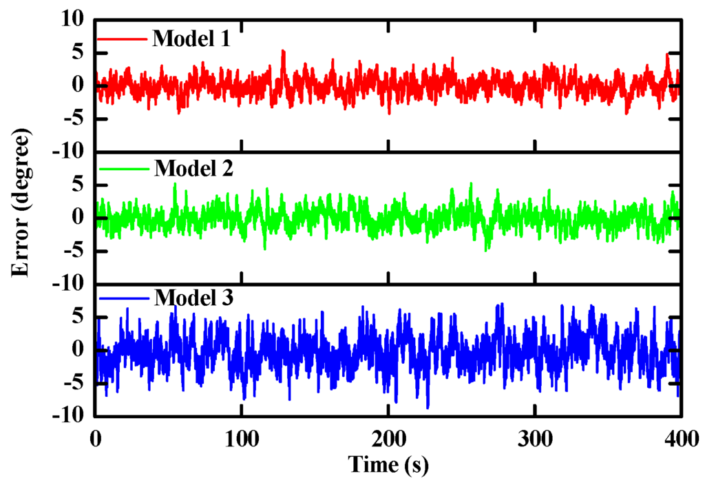 Time-varying pitch estimation errors based on three different sensor models.