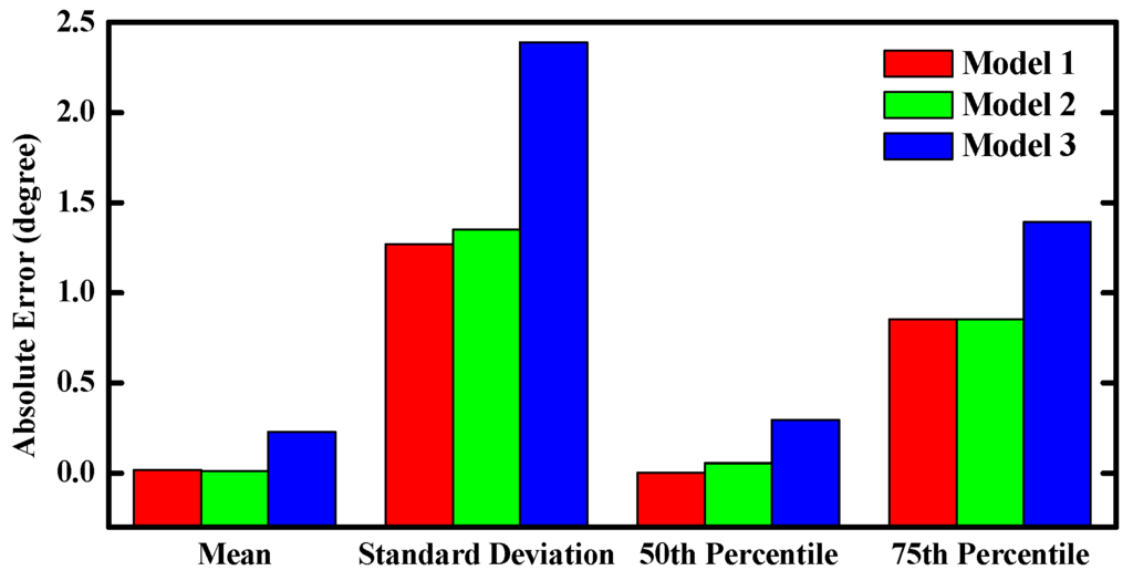 The “perfect” inertial observations (angular rates and accelerations) were obtained by inverse strapdown. Then, we corrupted these perfect observations by three types of errors generated from the three different sensor models. Finally, the proposed filter was executed with the three kind of corrupted observations. Figure 4 shows the time-varying pitch estimation error based on three different sensor models. Figure 5 shows performance comparisons of the absolute pitch estimation error. As shown in the plots, the proposed filter can achieve robust orientation estimation for different sensors errors models. It can be seen that the proposed filter provides the optimal estimation when the sensors’ noise is assumed as a white noise. Meanwhile, the results of the Gauss-Markov model are very close to the white noise model.
