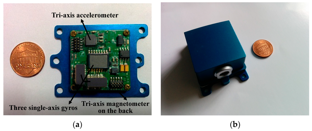 Accurate orientation is essential for the locating and tracking of moving objects relative to a given frame in various kinds of applications, such as unmanned aerial vehicle (UAV) navigation [1], autonomous underwater vehicle (AUV) [2], self-driving cars [3], intelligent robots [4], wearable devices [5], and human position tracking [6,7,8] etc., in military and industrial areas. Inertial sensors, such as the gyros and accelerometer make it possible to determine the orientation of moving object by measuring kinetic physical quantities (acceleration and angular rate, etc.) without any external additional information and other restrictions [9]. Gimbaled gyros, fiber optic gyros, and laser gyros have been successfully used to provide the high-precision movement information for the aircraft and missile systems in military and aviation industries. Given an initial assumption of the orientation, gyros can provide accurate orientation information via integrating the angular rates of the moving object numerically [10]. However, high-performance gyros are usually very expensive and bulky. Even the access to these devices may be limited. With the rapid expansions of the civilian and consumer markets, more and more micro-electro-mechanical system (MEMS)-based gyros are used for the low-precision orientation determination, benefited from their low price, small size, low-power dissipation, and relatively high reliability [11].