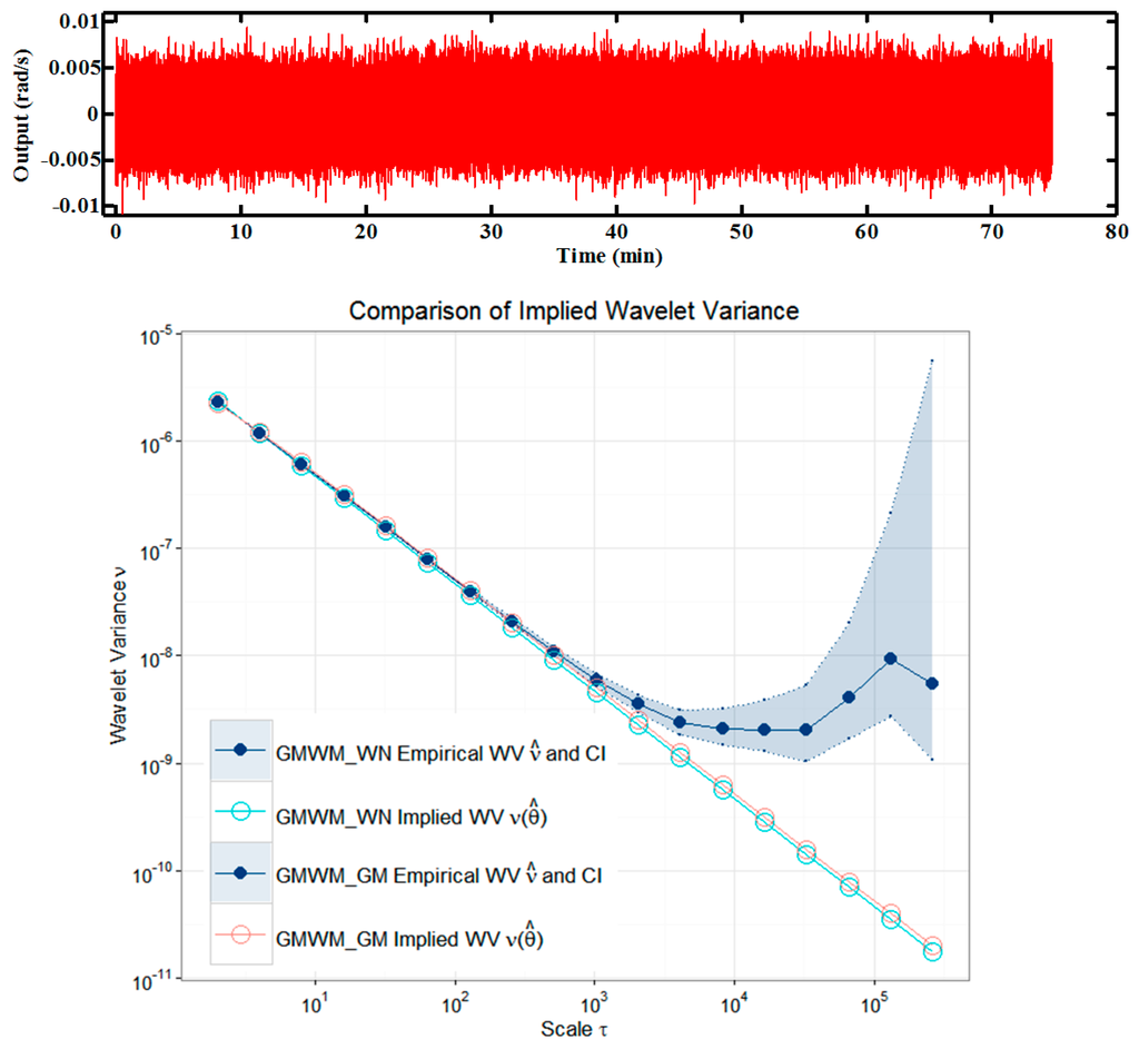 Firstly, we removed the mean of the original gyro signal produced in static tests at a frequency of 100 Hz (448,915 measurements). The time-varying errors are available and are presented in the time domain in Figure 7 (upper panel), together with the Haar wavelet variance (WV) and the corresponding GMWM for this process with 95% confidence intervals (lower panel). Similar results are achieved by the GMWM for a white noise process and a GM process, which validate the previous results in Section 4 again. The WV computed from the gyro signal give an indication for the underlying stochastic processes. The GMWM estimates of the parameters and their corresponding 95% confidence intervals using the WV covariances are summarized in Table 1. The suitability of the estimated models can be judged graphically by a matching of the empirical WV and the parametric WV using the estimates in Table 1.