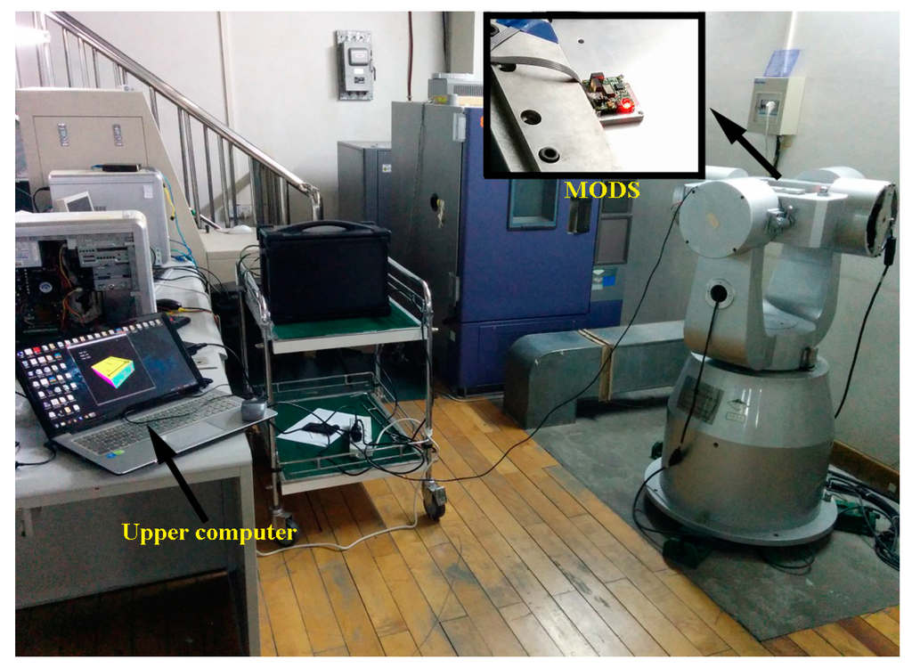As shown in Figure 8, the MODS was fixed on the static turntable relative to the ground during the static tests. In the majority of existing published literatures, orientation systems were usually kept at the zero input point so as to evaluate the static performance. In our paper, different static input points were tested in our static experiments. The attitude angles were tested from −80° to 80° and the heading was from 0° to 90°. The turntable was turned by 10° every time and would be held for a few seconds. During the dynamic test, the MODS was mounted on the running turntable which was controlled to execute the pre-set motions.