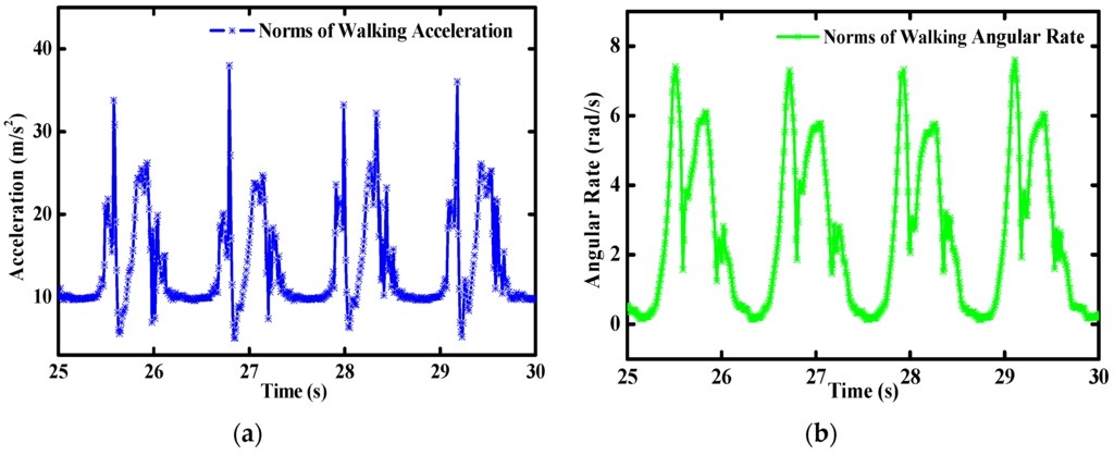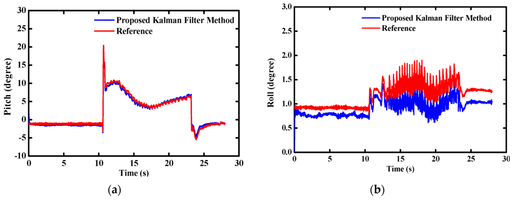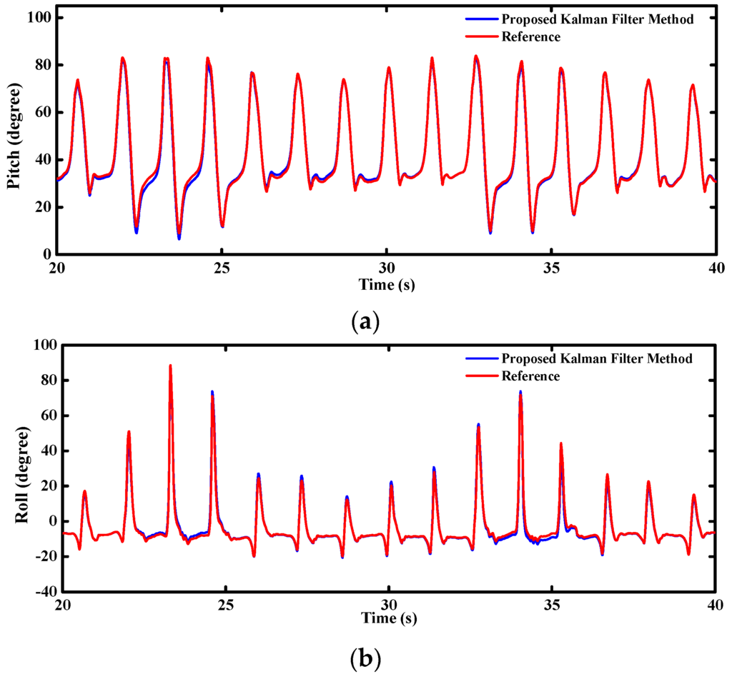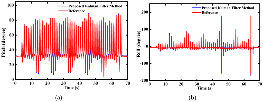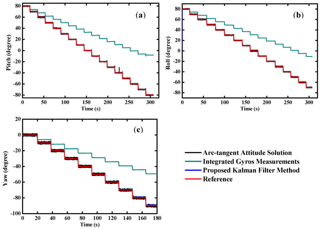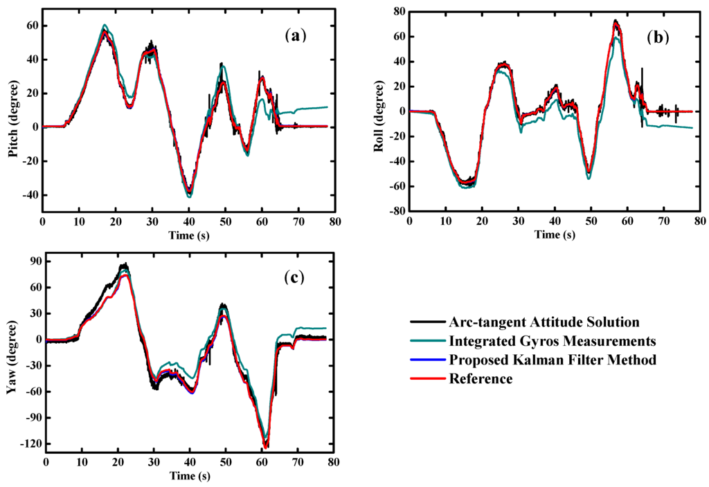 However, due to the inherent noise and drifts with time, there are considerable cumulative errors when only the gyros are used for the orientation determination. Various kinds of time series models are used to estimate the stochastic process of the gyro [12]. All of the published literature shows that the cumulative errors cannot be eliminated only according to the stochastic model of the gyro. Even for the extremely expensive MEMS gyros, the cumulative errors still cannot be neglected. Accordingly, it is necessary to integrate the gyro with some other sensors which there are no drifts and cumulative errors existing. Yun, et al. proposed a factored quaternion method for the orientation estimation [13]. Derivations of half-angle formulas were proposed in their paper. Taking advantage of the gravity decomposition, attitude angles (namely, the pitch and roll angles) are easily obtained from the accelerometer. Sequentially, the heading angle is available when the magnetometer is used. However, the gravity is coupled with the kinematic accelerations so strongly that it cannot be separated from the accelerometer outputs accurately, especially in the case of long-term high dynamics. Simultaneously, the geomagnetic field is very susceptible to the additional magnetic field induced by surrounding hard or soft magnet materials [14]. Due to the deviations among the directions of the geomagnetic field in different locations, it is not appropriate to use the magnetic data for the pitch and roll estimation. All the reasons above make the accelerometer and magnetometer play the role of aided sensors.