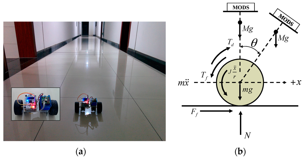 Tests on the two-wheel self-balancing vehicle (a) with MODS fixed on the vehicle; (b) schematic diagram for the vehicle driving.