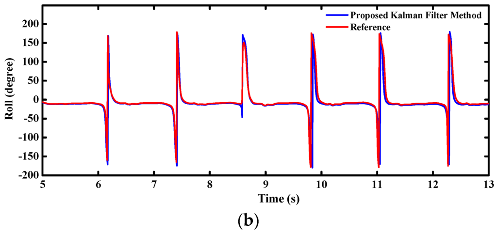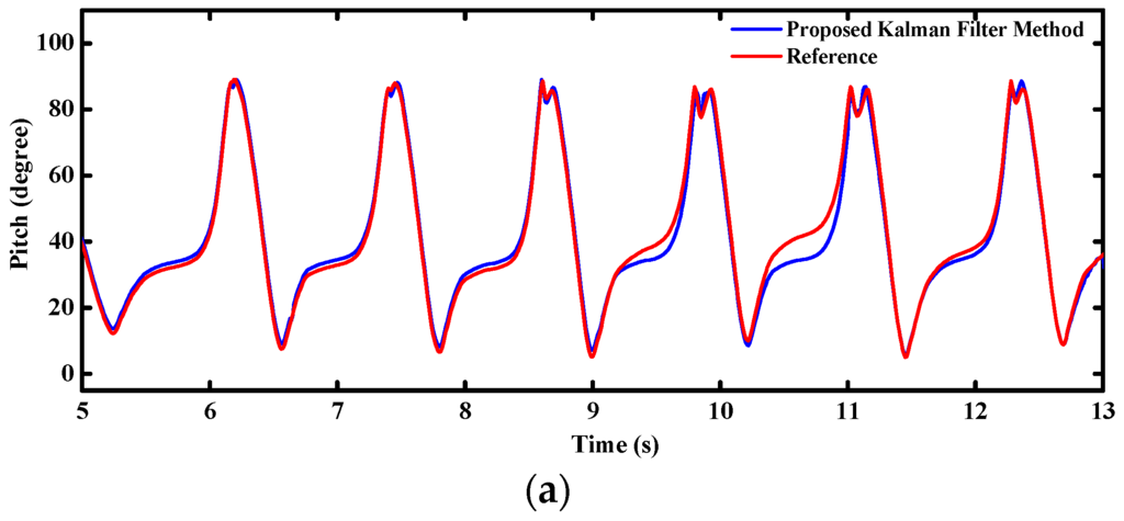A time consumption test was designed to validate the effects of proposed filter for reducing the system complexity and computing time by smaller matrix operations. We collected 31,120 row data from an existing orientation system [29] at 100 Hz which were used to run our filter in MATLAB ten times, repeatedly. Table 2 shows the comparisons of time-varying pitch errors estimated by our filter (Method A) and the proposed filter in [18] (Method B). The proposed filter precludes the impacts of geomagnetic distortions on the pitch and roll which the heading is subjected to. As shown in Table 2, the average RMS errors of proposed filter are reduced by 30.6% compared with Method B under strong magnetic disturbances. Meanwhile, mean computation times are reduced by 23.8%, which means that higher frequency can be implemented for the orientation updates.