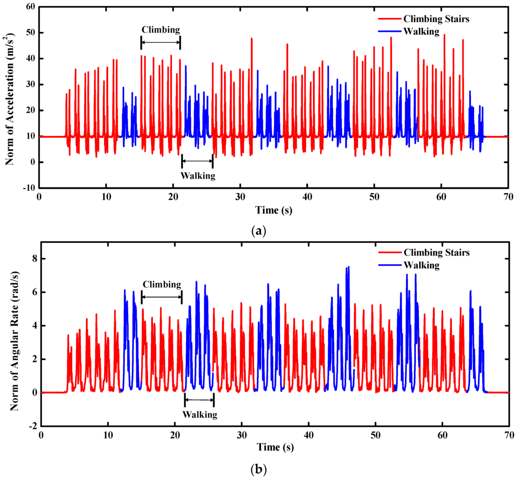 During the stair-climbing tests, the pedestrian was required to climb three floors including six half floors climbing and six corners walking which are corresponding to the red segments and the blue segments of the time-varying curves of the accelerations and angular rates in Figure 16. We can find out that the variation ranges of the climbing accelerations are much larger than that of the walking accelerations, but the variation ranges of the angular rates show an inverse tendency. Therefore, the proposed filter will rely more on the gyro outputs during the pedestrian walking, while the accelerometer outputs are considered more in the quasi-static attitude updates.