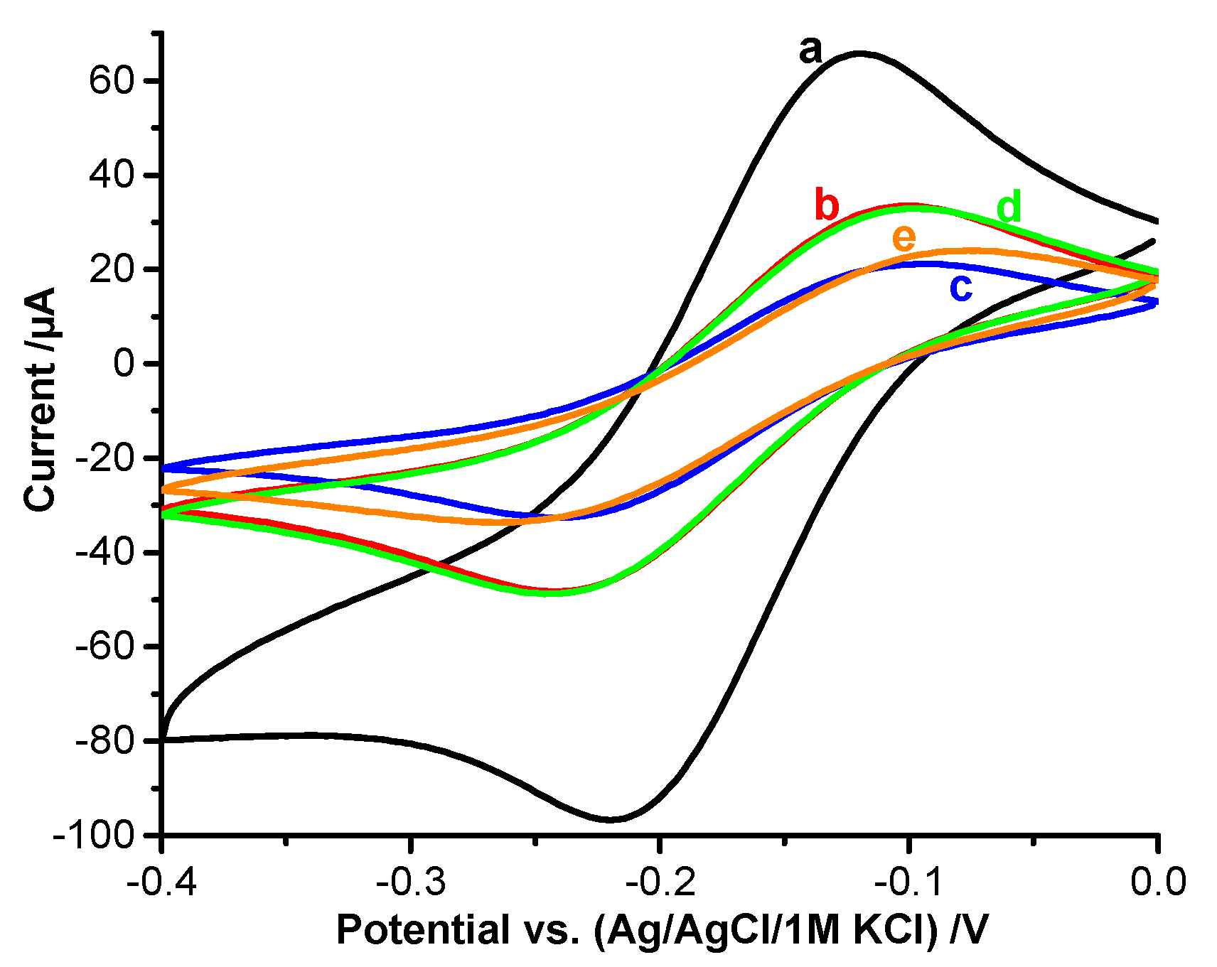 Figure 2. CVs of the redox marker [Ru(NH3)6]2+ for the different steps of MIP preparation (5 mM [Ru(NH3)6]2+ in 100 mM NaCl, pH 8, 100 mV/s): a—bare Au wire, b—after SAM-formation, c—after electropolymerization in presence of the template HTHP, d—after removal of HTHP, e—after rebinding in 1.3 mM HTHP solution for 1 h.