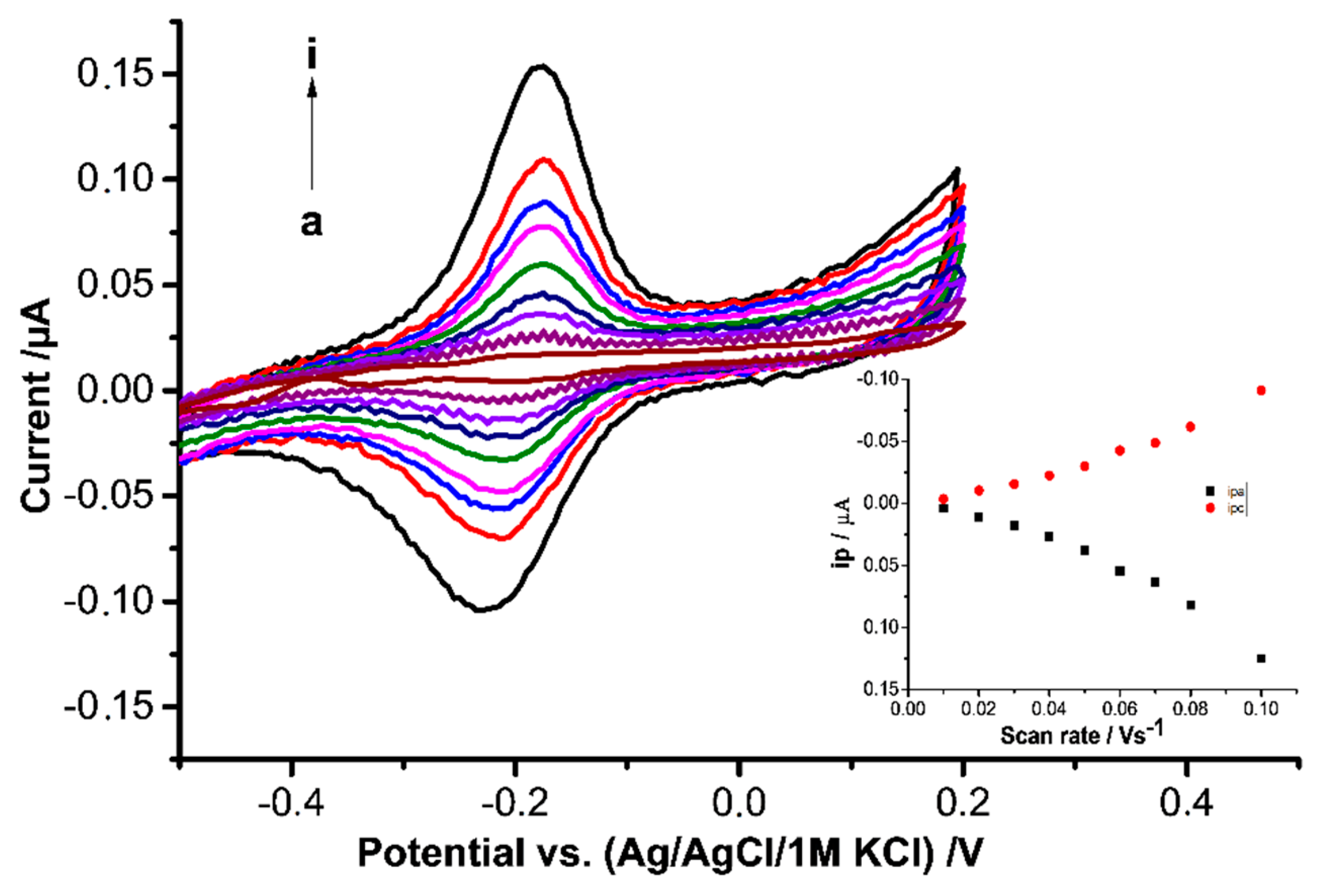 Figure 3. CVs at different scan rates for HTHP-MIP (after rebinding in 1.3 mM HTHP solution), a—i: 10, 20, 30, 40, 50, 60, 70, 80, 90, 100 mV/s in 2.5 mM Tris buffer, pH 8. Inset: Dependence of peak currents on scan rates.