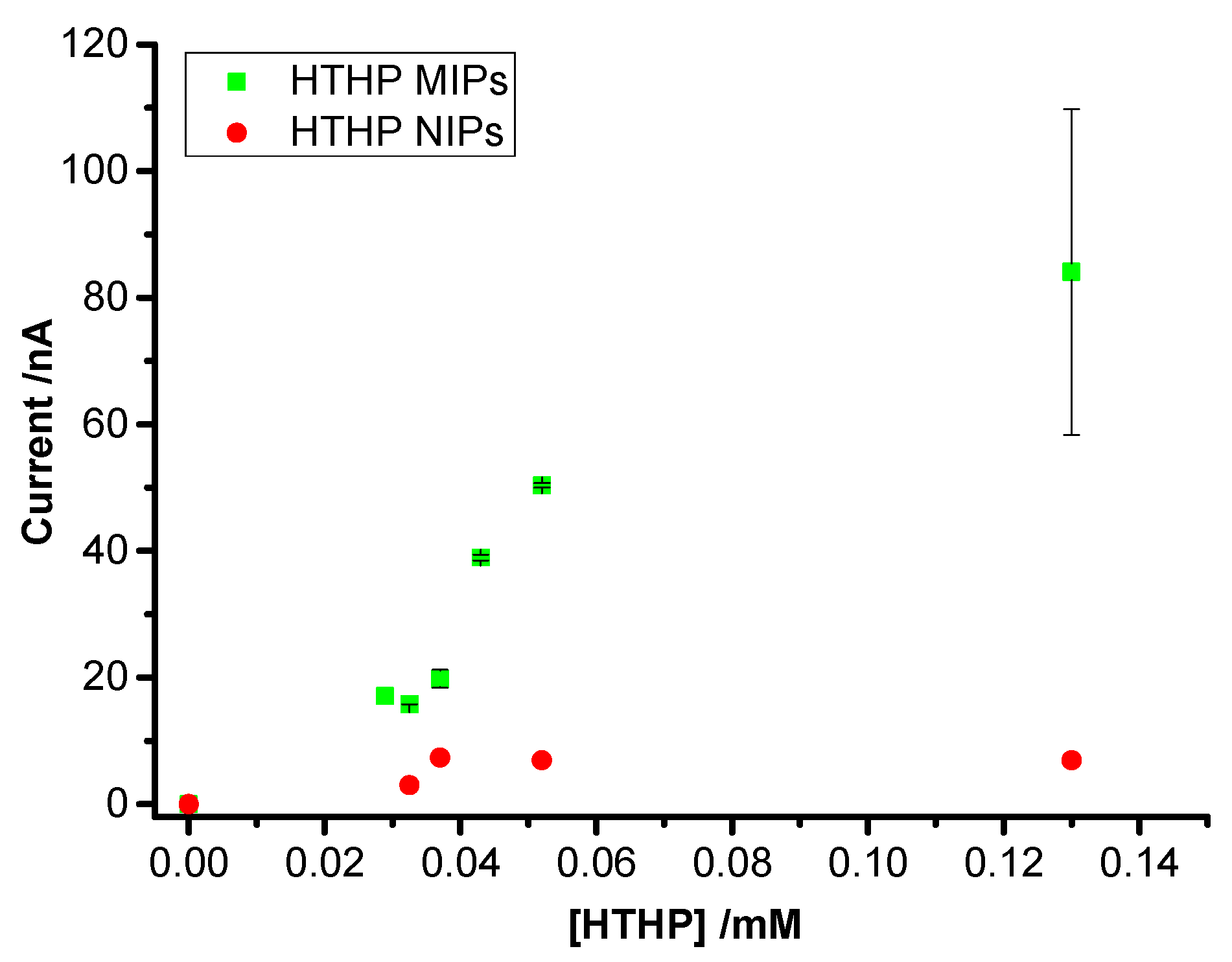 Figure 4. SWV peak currents for MIP- and NIP-modified electrodes after incubation in 2.5 mM K2HPO4–KH2PO4 pH 7 and different HTHP concentrations.