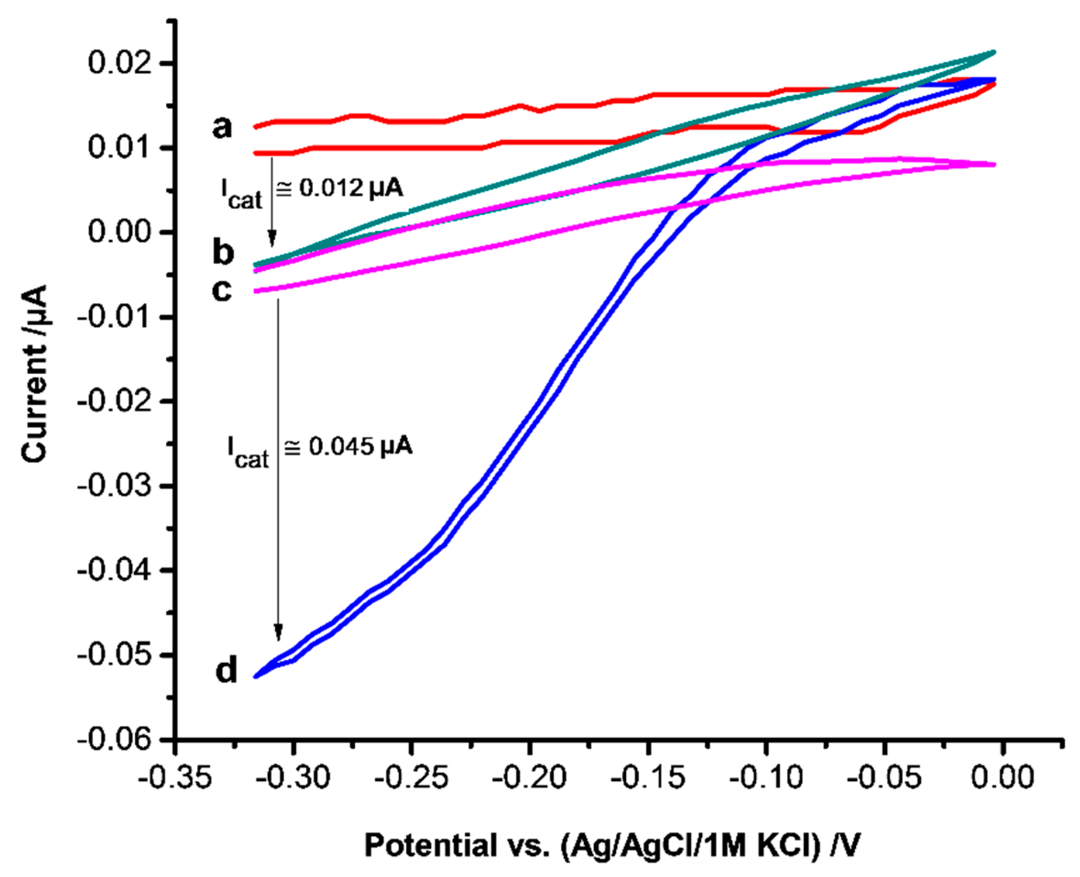 The bioelectrocatalytic reduction of H2O2 by HTHP MIPs was studied by incubating the electrodes in 52 µM HTHP solution for 1 h after the removal step. As shown in Figure 5, with curve d the catalytic current starts from around −0.1 V upon addition of hydrogen peroxide. Since no mediator is present, the reduction current should arise from the DET between the electrode and the heme protein [40,41]. However, the potential is 650 mV more negative than expected for the reduction of Fe4+ = O center of Compound I [42] but in accordance with reports on heme protein-modified electrodes describing the peroxide reduction at the potential where the heme is in the reduced state [43,44]. The catalytic current increased linearly with increasing concentration of H2O2 in the range from 10 to 100 µM and reached saturation at 150 µM. This behavior is comparable with the effect of other heme proteins on the reduction of H2O2 [40,44,45]. NIPs which were not in contact with HTHP gave a H2O2 reduction current (Figure 5b) which is almost 3.8 times smaller than that of the HTHP MIPs.