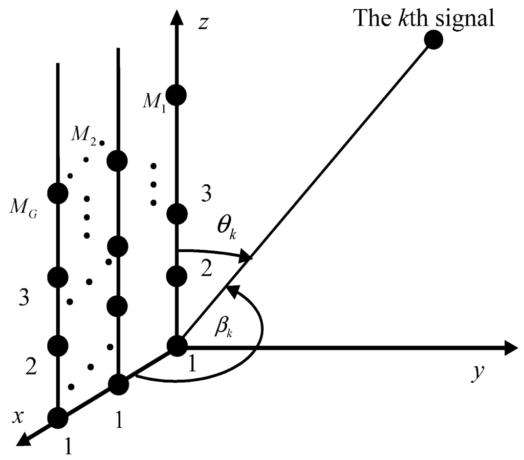 Consider an array consisting of G parallel uniform linear arrays. The array is located on xoz plane as shown in Figure 1, where the first linear array is located on the z axis. The coordinates of the sensors of the gth linear array successively are {(g − 1)d, 0, 0}, {(g − 1)d, 0, d},⋯,{(g − 1)d, 0, (Mg − 1)d}, where d = λ/2 and λ is the wavelength of incident signals. Suppose that K far-field narrowband signals impinging on this array and let θk and βk be the elevation angle and azimuth angle of the kth signal, respectively.