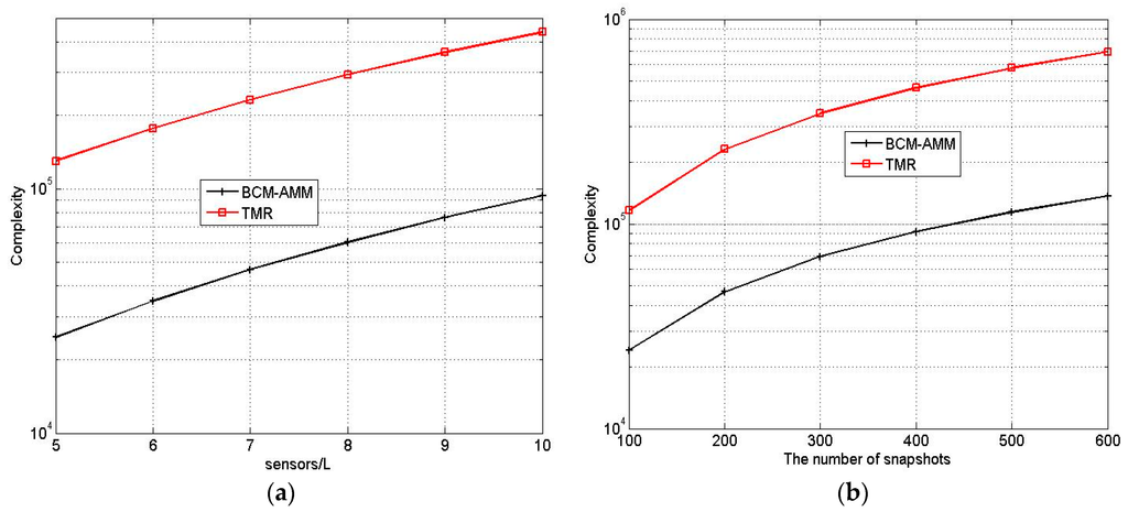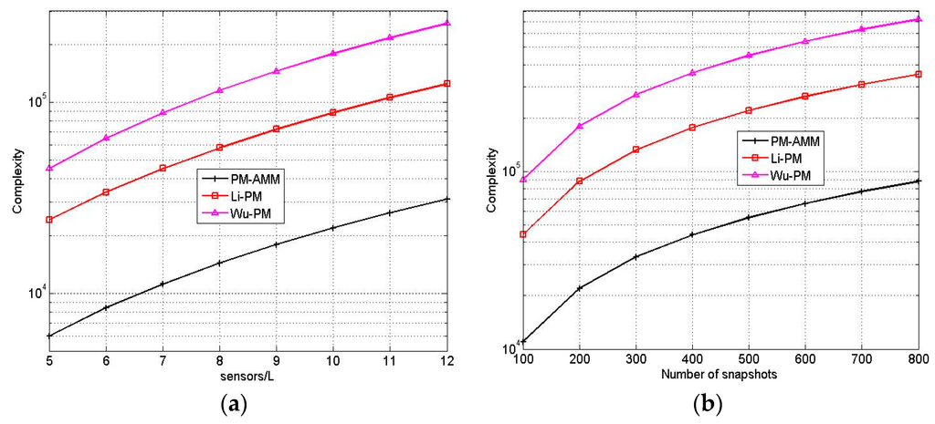 In Section 1, we have introduced many PM algorithms [10,11,12,13,14,15], where the algorithms [11,12,13,14] are based on L-shaped array and the algorithms [10,15] are based on two parallel arrays. Hence, we only compare the proposed PM-AMM to Wu’s PM [10] and Li’s PM [15] in this subsection. With , and the complexity of proposed PM-AMM is O{2NMT}. Suppose the number of elements for Li’s PM [15] and Wu’s PM [10] is 2L + 1, the complexity of Li’s PM is O{[2L+1]2T} and the complexity of Wu’s PM is O{(3L)2T}. To guarantee the same number of elements, if L is odd number, we let M = L +1 and N = L/2, and if L is even number, we let M = L and N = (L + 1)/2. Therefore, the complexity of proposed PM-AMM is O{(L+1)LT}. The complexity comparison versus different L and T is provided in Figure 2. It is observed that the complexity of proposed PM-AMM is far lower than that of Li’s PM and Wu’s PM. It is in the agreement with the theoretical analysis.