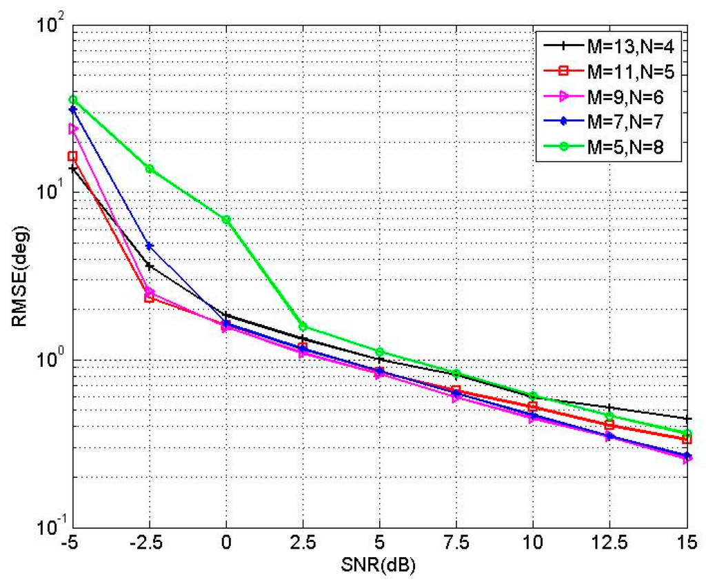 It is noted that the estimation performance when M = 11, M = 9 and M = 7 is better than that when M = 13, M = 5. In addition, the performance of M = 11 is slightly better than that of M = 7 and M = 9 when SNR is low. The results approximately support our viewpoint in Section 3.3 on the value selection of M and N. In the following two experiments, the parameter set of M = 11, N = 5 is chosen.