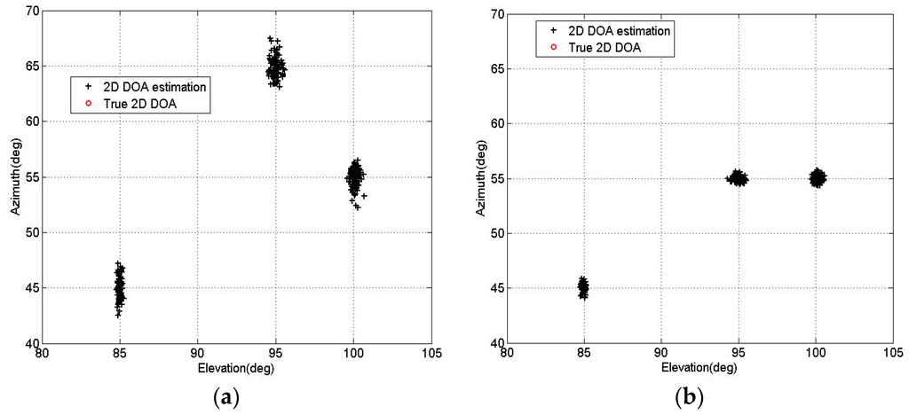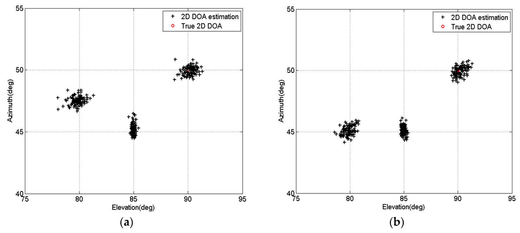 From Section 3.1, we know that the estimation accuracy of elevation angles is affected by the value of M. From Section 3.2, we also know that the estimation accuracy of azimuth angles is affected by the value of N. In addition, it should be noticed that the azimuth angles are obtained by estimated elevation angles. Hence, the accuracy of elevation angles also affects the accuracy of azimuth angles. It is difficult to determine the exact relationship between M and N, but after intensive experiments, the three-parallel linear array with M > N is chosen. To produce satisfactory performance, N should not be too small. In Section 6, the results of the first simulation experiment can roughly demonstrate the validity of this selection. Although we are unable to obtain the exact values of M and N, an approximate range is that N should be close to M/2.