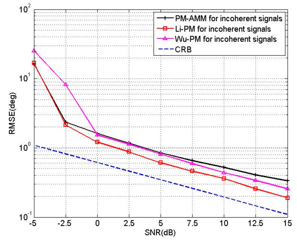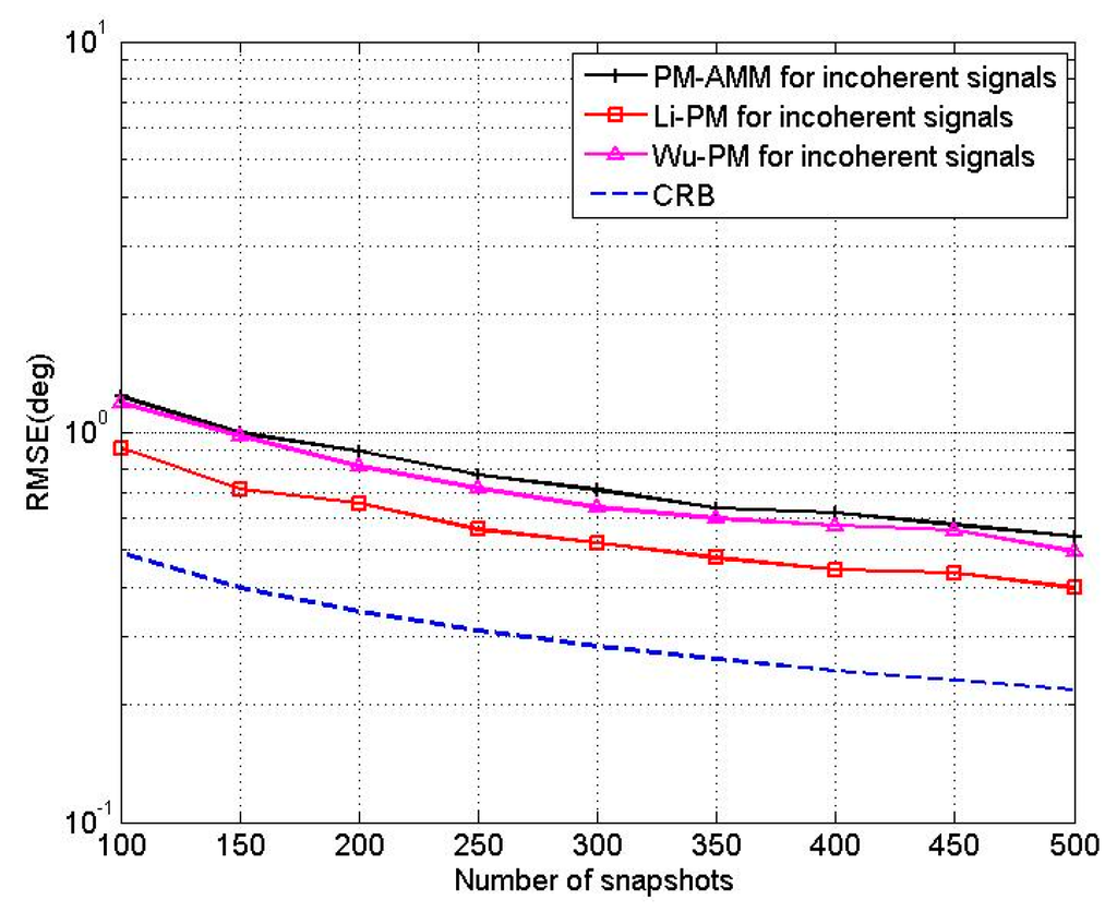 In the third experiment, we compare the proposed PM-AMM algorithm with Wu’s PM [10], Li’s PM [15] and CRB. A three-parallel array with M = 11, N = 5 is used, and two uncorrelated sources are located at the angles of , . For the Wu’s PM [10] and Li’s PM [15], we use an 11-element linear array and a 10-element linear array, respectively. Figure 6 shows the RMSEs of the proposed PM-AMM, Wu’s PM and Li’s PM versus SNR with T = 200. Figure 7 shows the RMSEs of proposed PM-AMM, Wu’s PM and Li’s PM versus snapshots with SNR = 5 dB. Inspecting both figures shows that the estimation precision of the proposed PM-AMM is close to that of Li’s PM and Wu’s PM. Keep in mind that from the complexity analysis, the complexity of the proposed PM-AMM is far lower than that of Li’s PM and Wu’s PM. Therefore, the PM-AMM is an attractive option to practical uses.