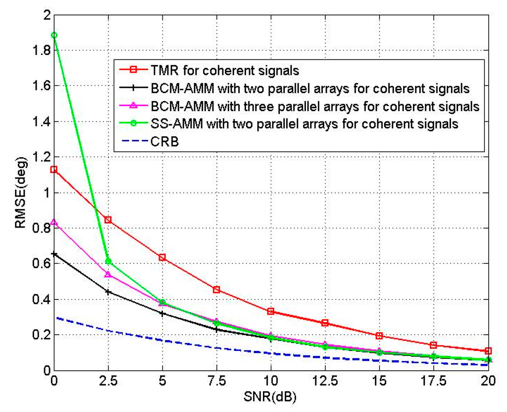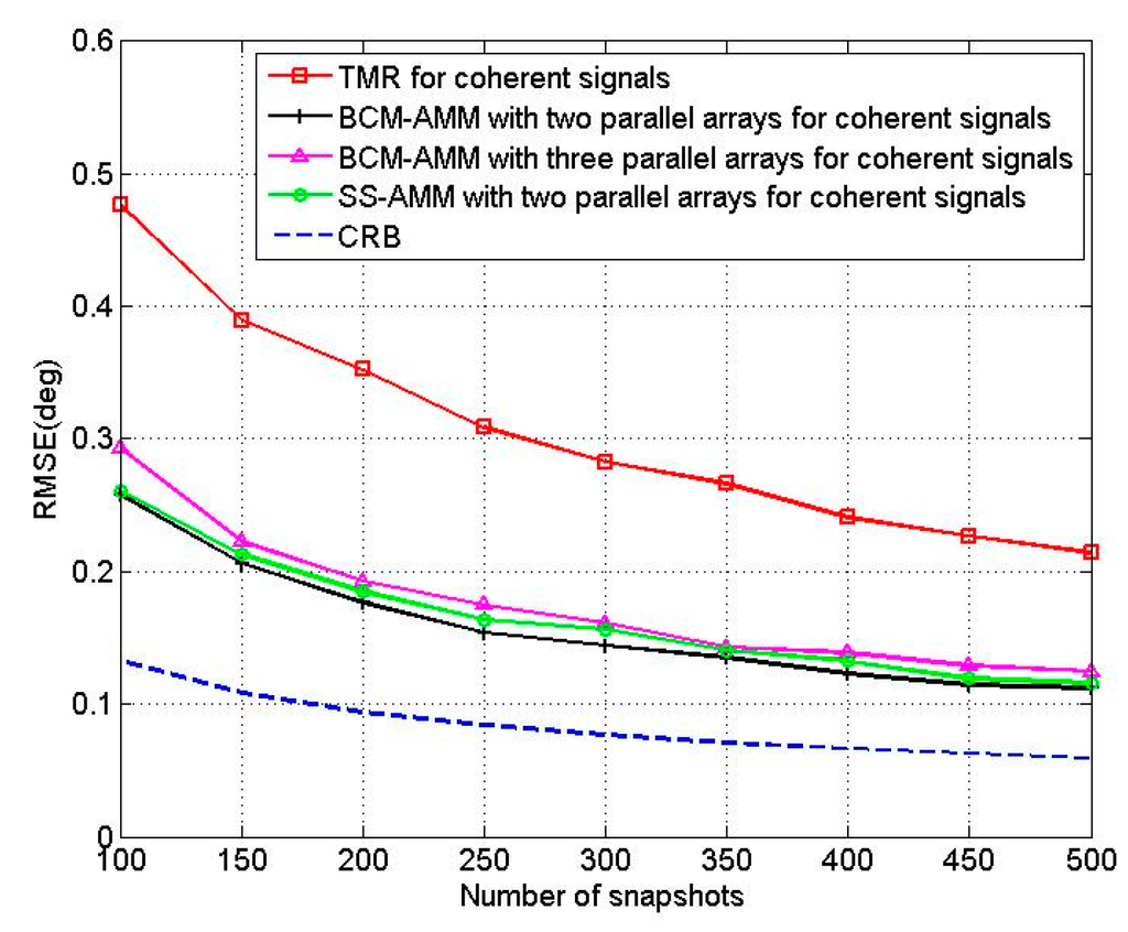 In the fifth experiment, we compare the BCM-AMM algorithm with TMR algorithm [25], SS-AMM and CRB. We called the algorithm that SS technology combines with AMM as SS-AMM. For the BCM-AMM algorithm, we use a two-parallel array with M = 15, N = 15 and a three-parallel array with M = 14, N = 8, respectively. For the TMR algorithm [25], we use two 15-element linear arrays. Two coherent sources are located at the angles of , . Figure 9 shows the RMSEs of the proposed BCM-AMM algorithm and TMR algorithm versus SNR with T = 200. Figure 10 shows the RMSEs of the proposed BCM-AMM algorithm and TMR algorithm versus snapshots with SNR = 10 dB. The two figures show that the estimation precision of the proposed BCM-AMM algorithms is higher than that of the TMR. Figure 9 and Figure 10 also show that the precision of BCM-AMM with two-parallel array is better than the BCM-AMM with three-parallel array for coherent signals. In addition, from Figure 9, we can find that BCM shows better performance than SS in the case of low SNR.