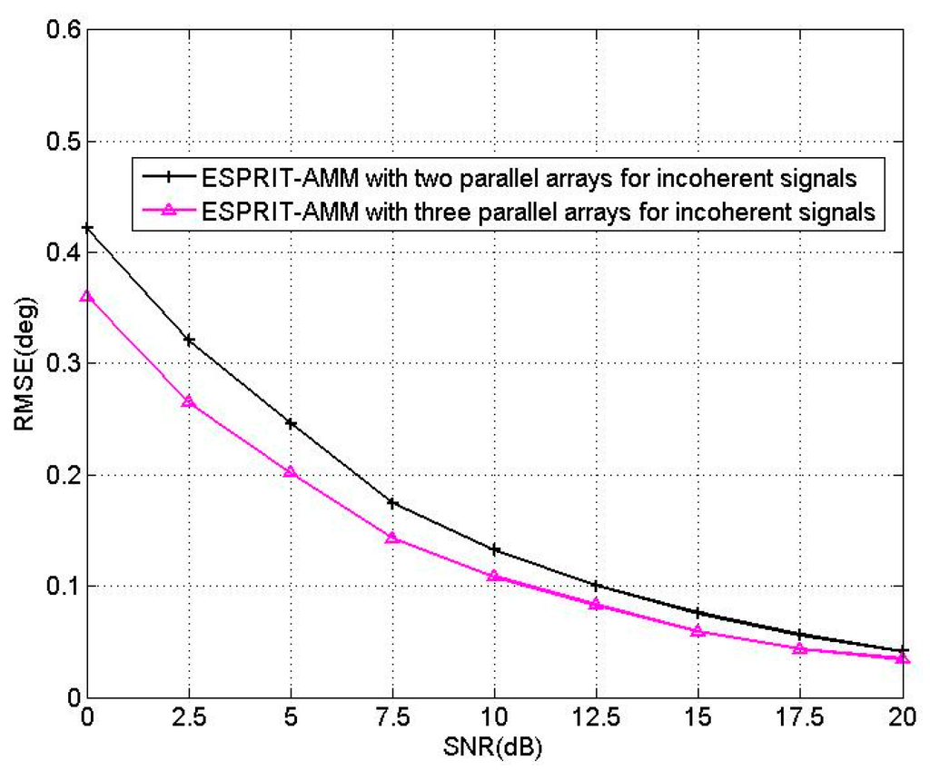 In the sixth experiment, we consider two incoherent sources located at the angles of , . The RMSEs of BCM-AMM for two-parallel array and three-parallel array are provided. Since the two signals are incoherent, the ESPRIT-like algorithm is utilized to estimate elevation angles. Therefore, the BCM-AMM algorithm should be changed to ESPRIT-AMM algorithm. Figure 11 shows the RMSEs of proposed ESPRIT-AMM algorithms versus SNR with T = 200. From Figure 11, it is observed that the precision of ESPRIT-AMM with three-parallel array is better than that of the ESPRIT-AMM with two-parallel array for incoherent signals.