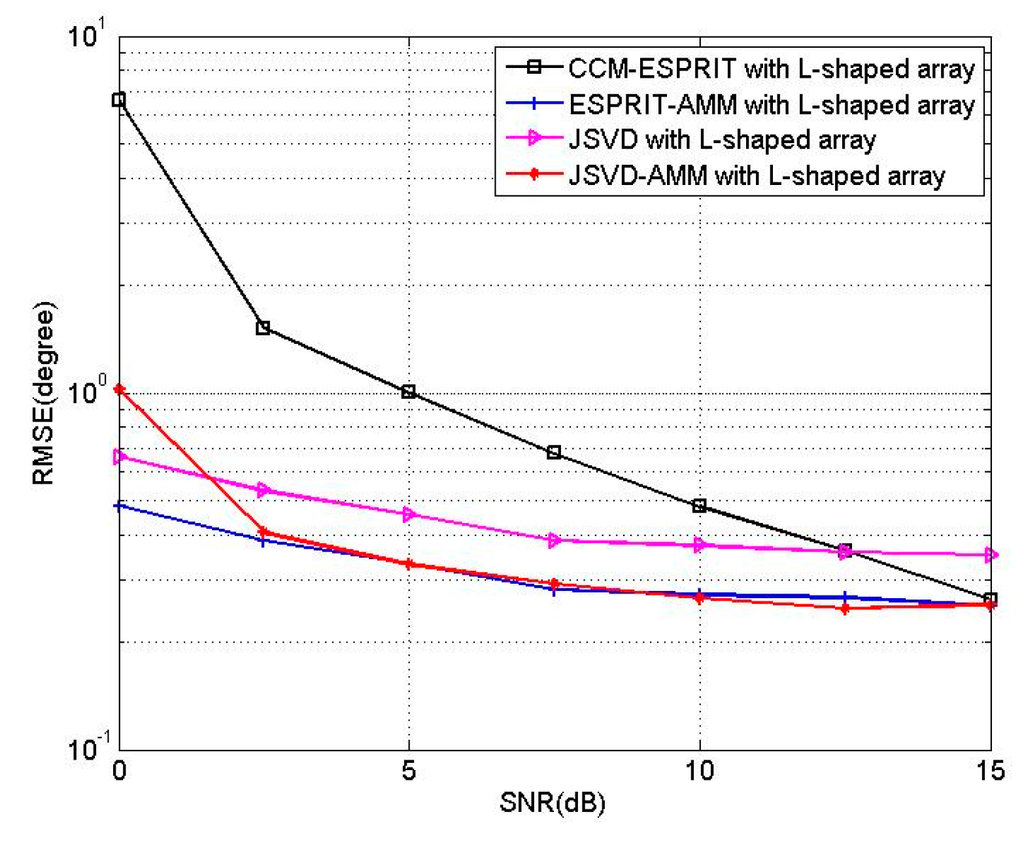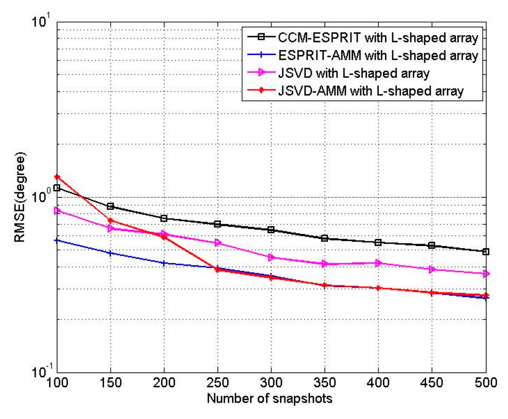 In the last experiment, we test the performance of JSVD-AMM and ESPRIT-AMM for L-shaped array. We consider an L-shaped array consisting of two 10-element linear arrays, and three incoherent sources located at the angles of , . Figure 12 shows the RMSEs of JSVD-AMM, ESPRIT-AMM, JSVD [9] and CCM-ESPRIT [17] versus SNR with T = 500. Figure 13 shows the RMSEs of JSVD-AMM, ESPRIT-AMM, JSVD [9] and CCM-ESPRIT [17] versus snapshots with SNR = 10 dB. From Figure 12, it is observed that the performance of JSVD-AMM is better than that of the JSVD with SNR > 2.5 dB and the performance of ESPRIT-AMM is better than CCM-ESPRIT with SNR < 15 dB. From Figure 13, it is observed that the performance of JSVD-AMM is better than that of the JSVD with snapshots >200 and the performance of ESPRIT-AMM is better than CCM-ESPRIT for different snapshots. But we should not neglect that JSVD-AMM and ESPRIT-AMM have obvious advantages in reducing complexity, which shows in Section 5.