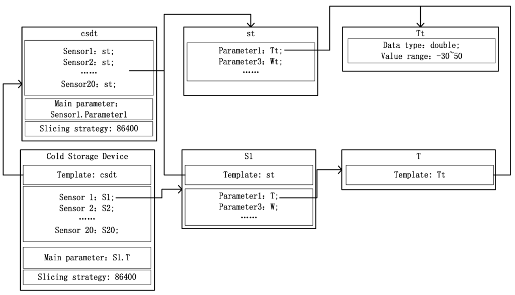 Figure 2, there are several sensor templates in each device template and there are several parameter templates in each sensor template. For each device, sensor, or parameter template, there may be several corresponding devices, sensors, or parameters, respectively. A device in different templates may contain the same sensor, while a sensor in different sensor templates may contain the same template parameter. In device templates, we need to set the main parameter, which is used for data synchronization. A splice strategy is also needed. Since devices may be logical, we can combine some related sensors to create a virtual device, which is also supported by the device templates.