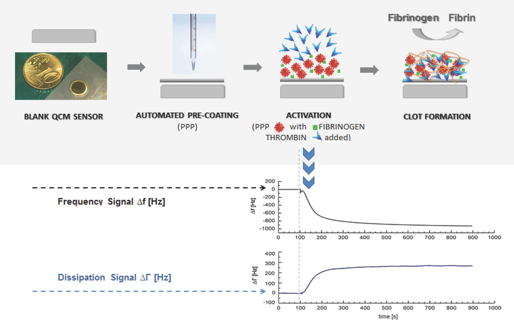 The presented QCM-D sensor method for the assessment of fibrinogen levels provides great advantages, including savings of cost and time and a great potential for miniaturization and point of care measurements. Since the surface coating is integrated as part of the measurement setting, quartzes can be stored easily and no interaction with external coating materials needs to be feared. The QCM-D device we used is small (260 × 317 × 197 mm3) and easy to handle due to its automated script controlled operation. There is no delay in transportation time, sample turn or result processing. The results draw attention to new and interesting alternatives for the assessment of fibrinogen levels by QCM-D sensors.