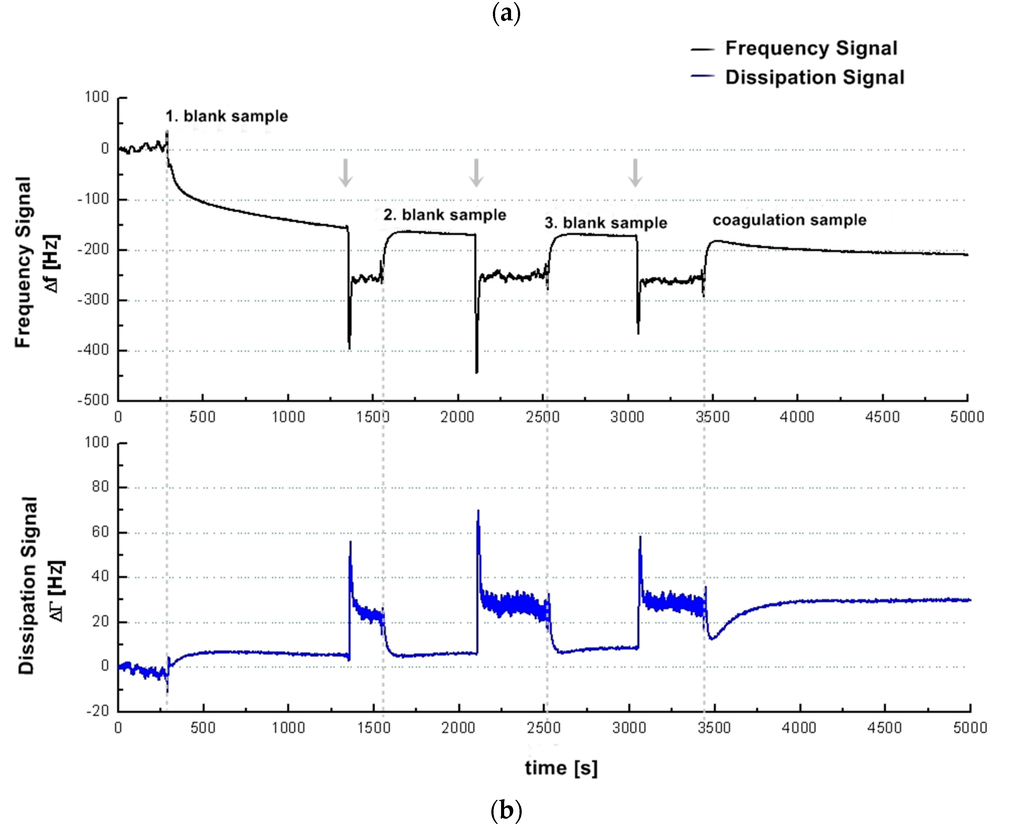 - Hussain, M.; Northoff, H.; Gehring, F.K. Dqcm beating the standard coagulometer in the domain of sensitivity range and information for hemostasis of human plasma. Biosens. Bioelectron. 2015, 66, 579–584. [Google Scholar] [CrossRef] [PubMed]