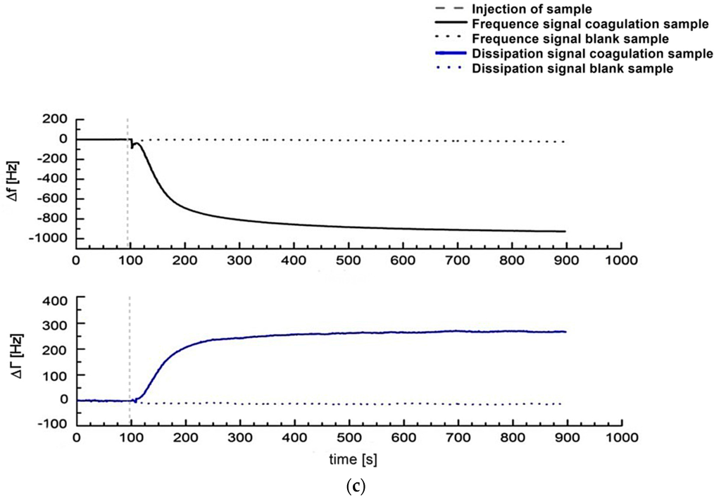(a) Illustration of the general idea of a QCM-based coagulation measurement based on the Clauss assay on a pre-coated quartz (PPP); (b) Experimental series with consecutive injection of three blank samples (PPP + imidazole buffer, 1:10 diluted) and one coagulation sample (PPP + thrombin reagent, 1:10 diluted) from healthy donor I into the measurement chamber using healthy donor’s plasma and a blank quartz surface cleaned in acetone. Dotted vertical lines: script-automated injection of the mixed samples to the quartz chamber by pump that lasted several seconds. Then the pump was stopped. Arrows: new start of pump with imidazole buffer flow after each measurement in order to proceed with the experimental series until the injection of the next mixed sample; (c) 1:10 diluted measurements with coagulation sample (solid line, PPP + thrombin reagent) and blank sample (dotted line, PPP + imidazole buffer) of healthy donor II using a pre-coated quartz surface with 1:10 diluted donor’s own PPP. Vertical line: script-automated injection of the mixed samples to the quartz chamber by pump that lasted several seconds. Then the pump was stopped.