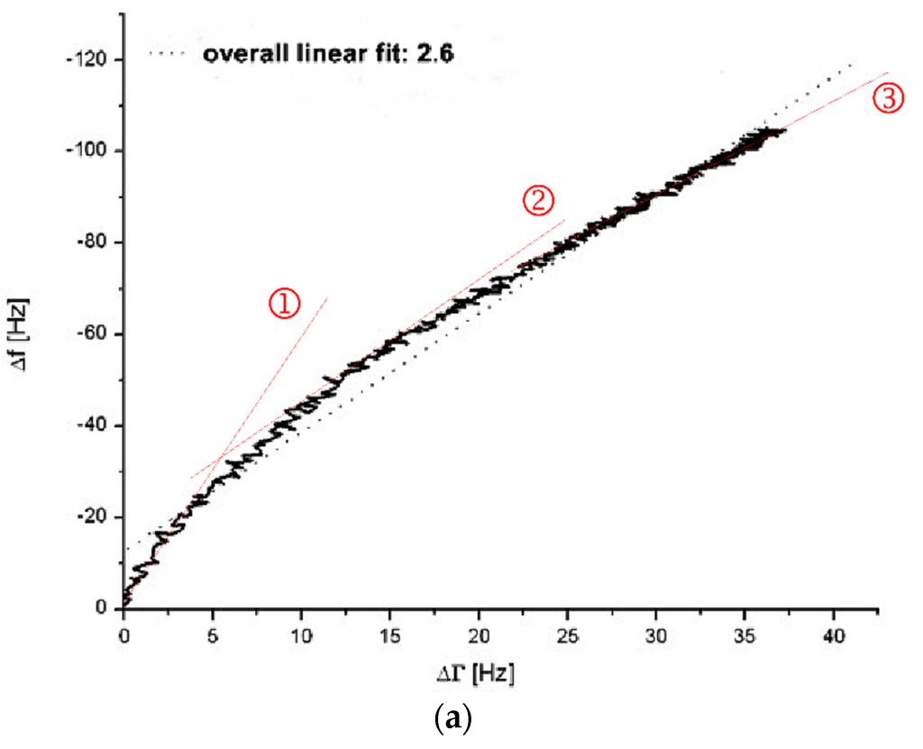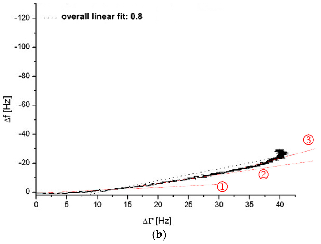 - Du, B.; Johannsmann, D. Operation of the quartz crystal microbalance in liquids: Derivation of the elastic compliance of a film from the ratio of bandwidth shift and frequency shift. Langmuir 2004, 20, 2809–2812. [Google Scholar] [CrossRef] [PubMed]