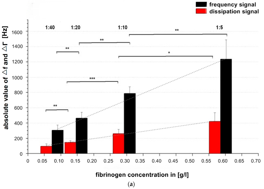 In Figure 3a all signal changes per concentration are significant. As the concentration of fibrinogen increases, the value of ∆f also increases, indicating a larger fraction of mass attached to the surface. At the same time the value of ∆Γ increases, indicating increased viscosity. Our results are in agreement with and confirm the results of Lakshmanan et al. [38,42] and Hussain et al. [25] by showing that signal changes depend on the fibrinogen concentration and that ∆f changes more with raising fibrinogen concentration than ∆Γ ( see grey dotted slope lines Figure 3a).