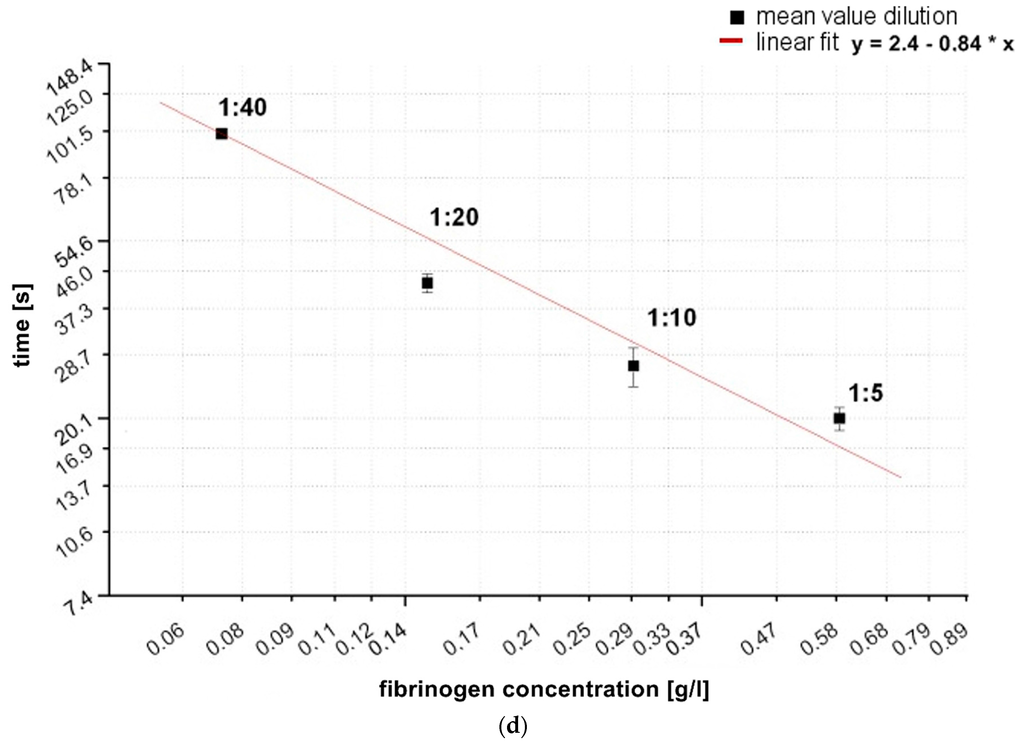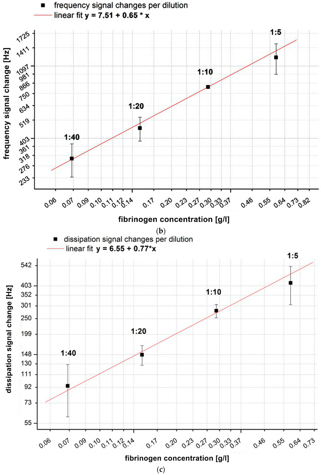 In order to evaluate the QCM-D-based CFA in regard to possible quantification of fibrinogen in plasma, we applied a protocol analogue to the establishment of CFA calibration curves. A dilution series of reference pool plasma ranging from 1:5 to 1:40 (corresponding to a range of 0.59 g/L to 0.07 g/L fibrinogen) was measured. ∆f (Figure 3a,b), ∆Γ (Figure 3a,c) were determined and the turning point of the frequency signal shift (tfQCM) (Figure 3d) was calculated from the ∆f curve. tfQCM is defined as the time difference ∆t between thrombin injection and the mathematically calculated turning point of the frequency curve (OriginLab software). Using a 1:10 dilution, the tfQCM values matched with the Merlin-based coagulation values.