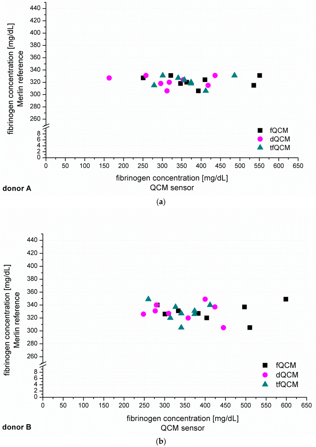 As expected, the results of the external references in Table 1 do correspond very well with each other. The QCM-D-based results present higher fibrinogen values than the external reference methods for donor A–F. The internally standardized Merlin reference does not correspond well with the results of the externally standardized references. It rather matches with the higher QCM-D-based results. This effect can probably be attributed to the fact that the Merlin measurements were conducted at the same time, with identically treated plasma and an identical thrombin reagent. The thrombin reagent used for the QCM-D and Merlin-based results was compared to the one used at the external central laboratory of the university hospital (UKT-ZL) by the reference institute of bioanalytics in Bonn, Germany, sending blind samples for testing to laboratories all over Germany. The comparison demonstrated that the reagent used by the UKT-ZL constantly resulted in slightly lower fibrinogen results [44]. Most likely, that finding does not solely explain the presented differences in results, but it definitely contributes a substantial part. Studies show that fibrinogen results vary widely depending on