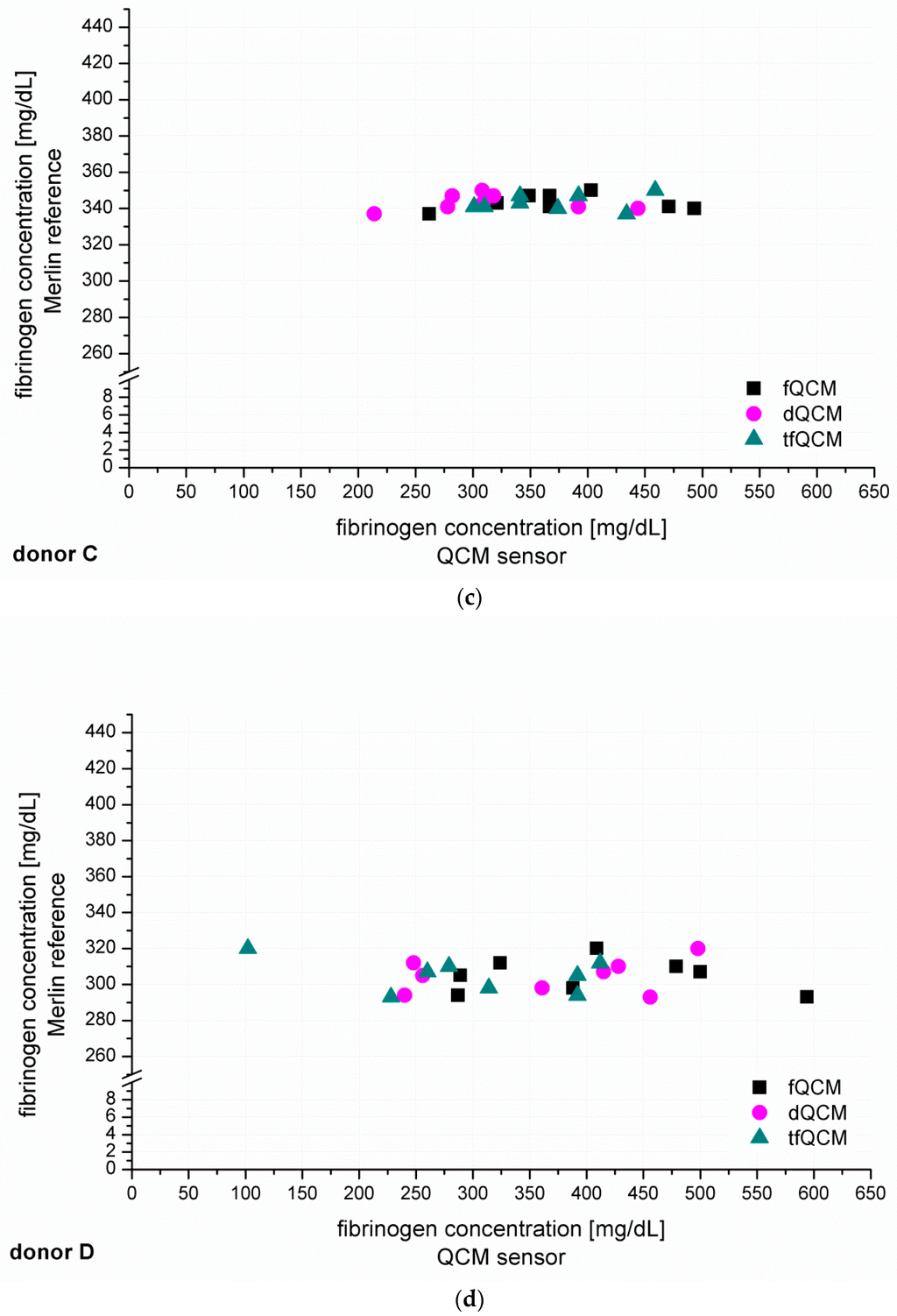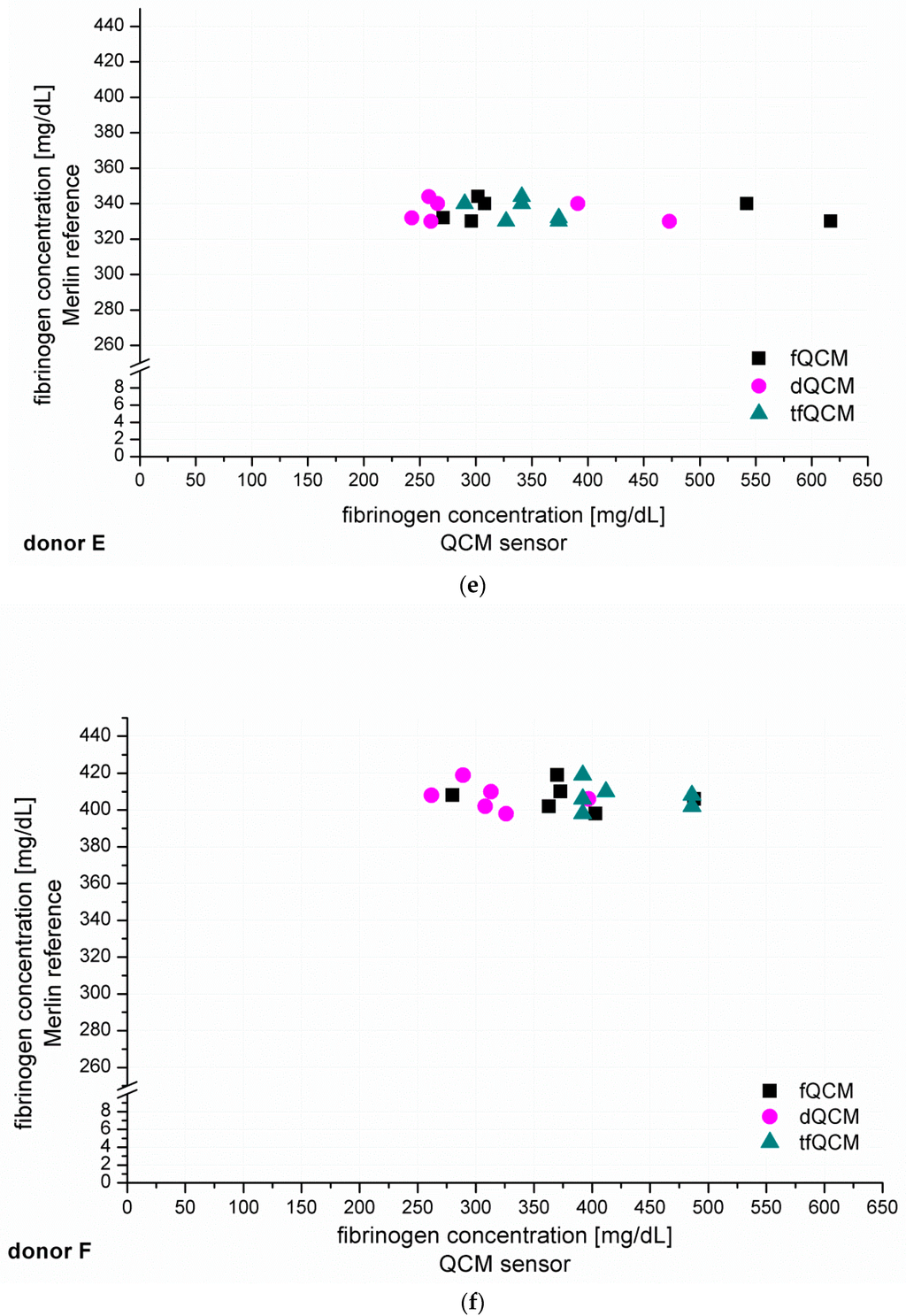 Figure 5 illustrates the comparison of the coagulation time measured with the internal Merlin reference and the tfQCM that led to the fibrinogen concentration results of donor A–F in Table 1, lines 4 and 5.
