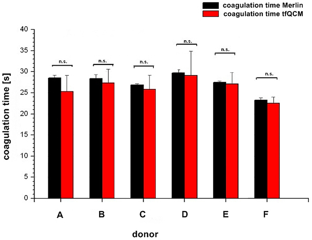 Comparison of coagulation times between Merlin coagulometer (black column) and tfQCM (red column) based on the fibrinogen concentration results in Table 1. The x-axis shows the different donors A–F. The y-axis shows the coagulation time. Results of coagulation time from both parameters are not significant (n.s.) with p ≥ 0.05.