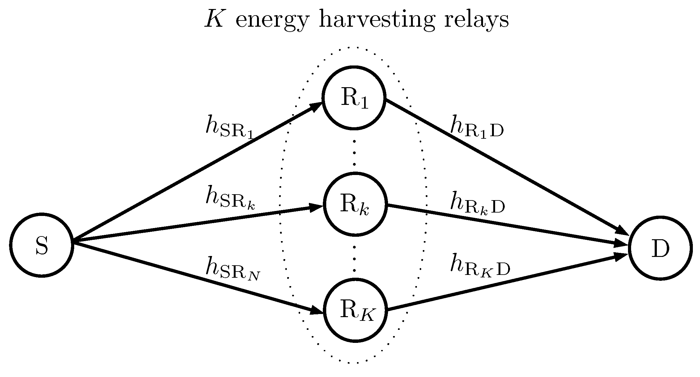 - Nasir, A.; Zhou, X.; Durrani, S.; Kennedy, R. Throughput and ergodic capacity of wireless energy harvesting based DF relaying network. In Proceedings of the 2014 IEEE International Conference on Communications (ICC), Sydney, NSW, Canada, 10–14 June 2014; pp. 4066–4071.