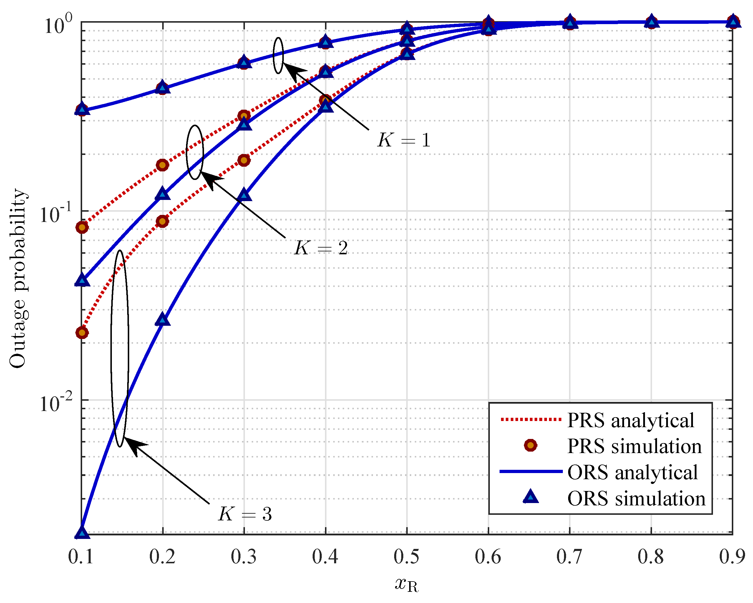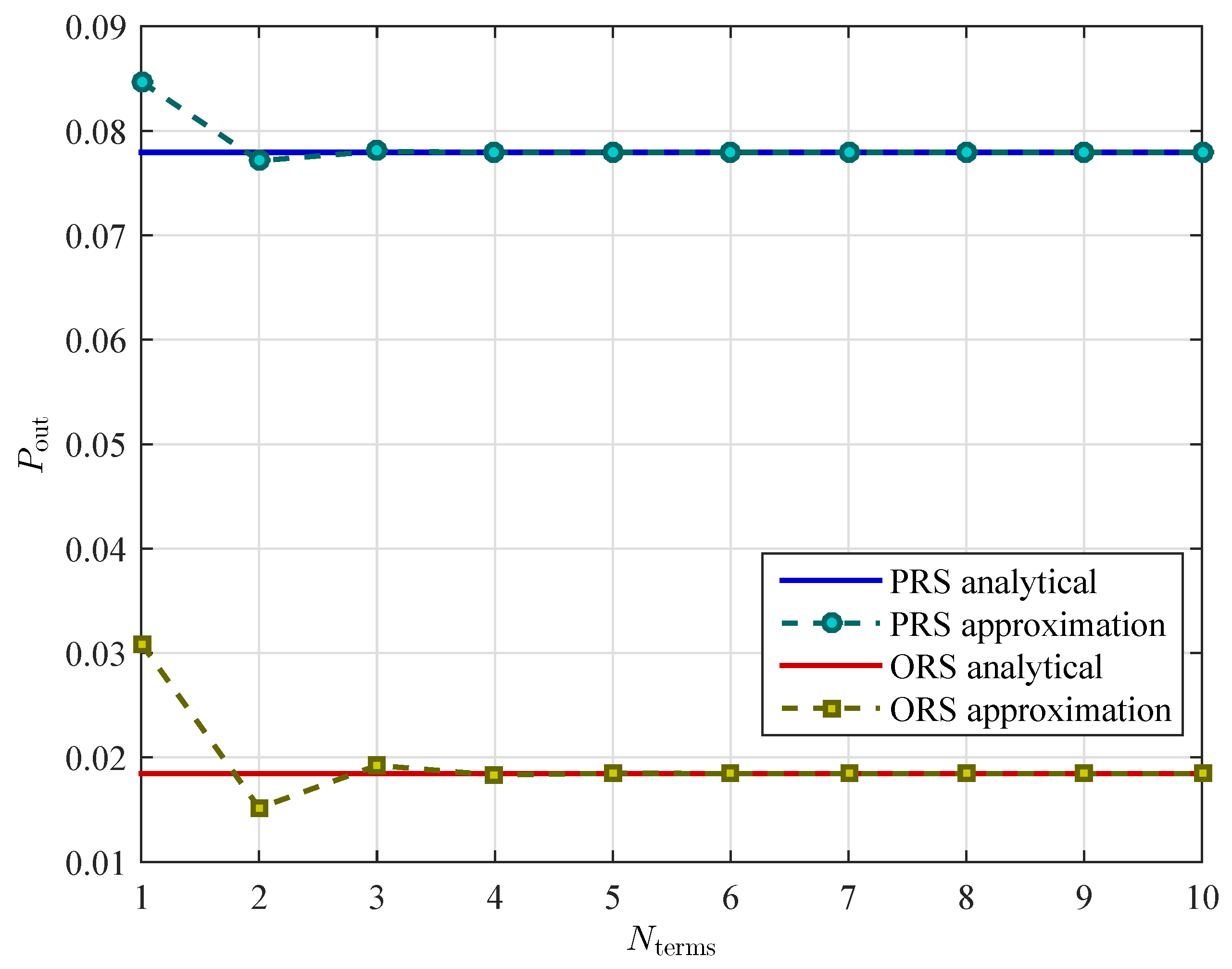 In Figure 3, we examine the convergence of the approximation for the outage probabilities of both PRS and ORS schemes. Here denotes the number of terms that we use in the Maclaurin series. As we can see from Figure 3 that the approximations quickly converge to the exact values after just few terms, i.e., 4 terms.