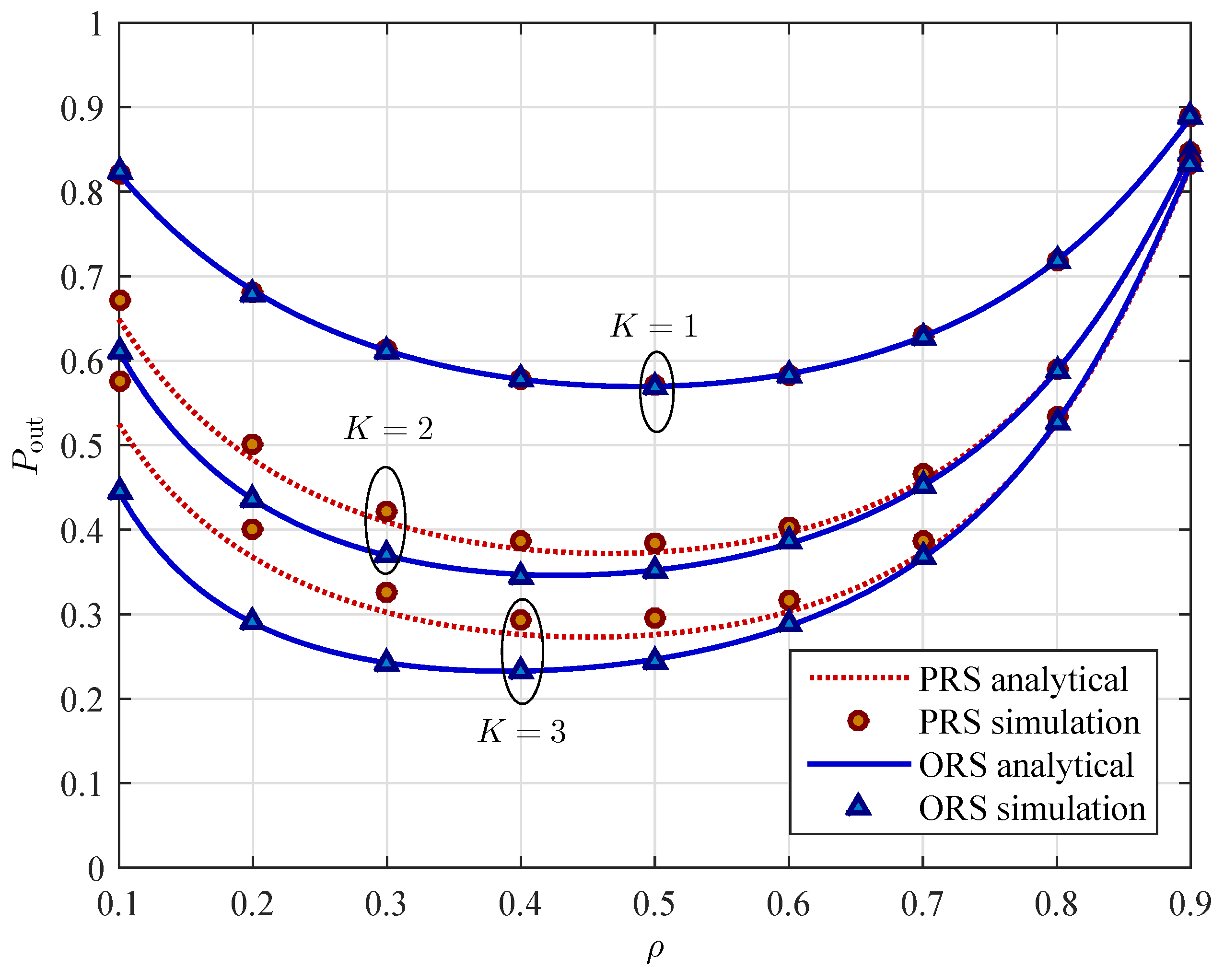 Figure 5 presents the outage probability of the two schemes as a function of the power splitting ratio ρ. From Figure 5, we can observe that the outage probability is a convex function with respect to the power splitting ratio . Therefore, there is an optimal value of ρ for which the OP is minimum. For example, with our current parameter setting, the optimal value of ρ is statistically around for both schemes. As we can see in Figure 5, the OP of both PRS and ORS schemes decreases as ρ increases from 0 to the optimal value and then it increases as ρ increases from the optimal value to 1. The reason is that increasing value of ρ results in the higher transmit power that the relay uses for sending the source information to the destination. Consequently, the better received SNR at the destination in the second phase is obtained and the OP of relay-destination transmission decreases. However, as the power splitting ratio ρ increases higher than the optimal value, the less energy is used for the relay to decode the information from the source signal. Therefore, the OP of the source-relay transmission increases. Note that the relay cannot harvest energy and decode information of the source signal at the same time. Hence, increasing power splitting ratio results in more energy can be harvested and used to forwarding signal, but less energy remains for decoding information.