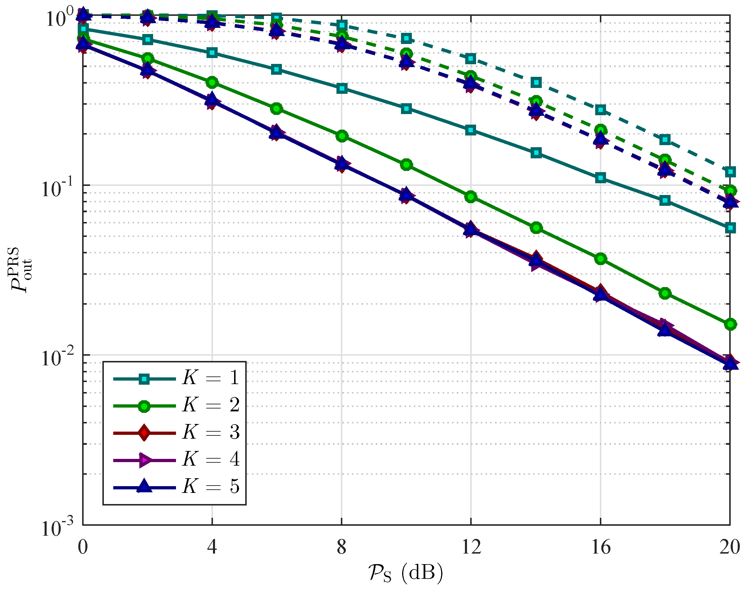 Outage probability of the PRS scheme versus the transmit power of the source for different values of the number of relays K with , and bits/s/Hz. The solid lines represent the OP of the PRS scheme in wireless energy harvesting cooperative networks. The dashed lines represent the OP of the PRS scheme in conventional cooperative networks.