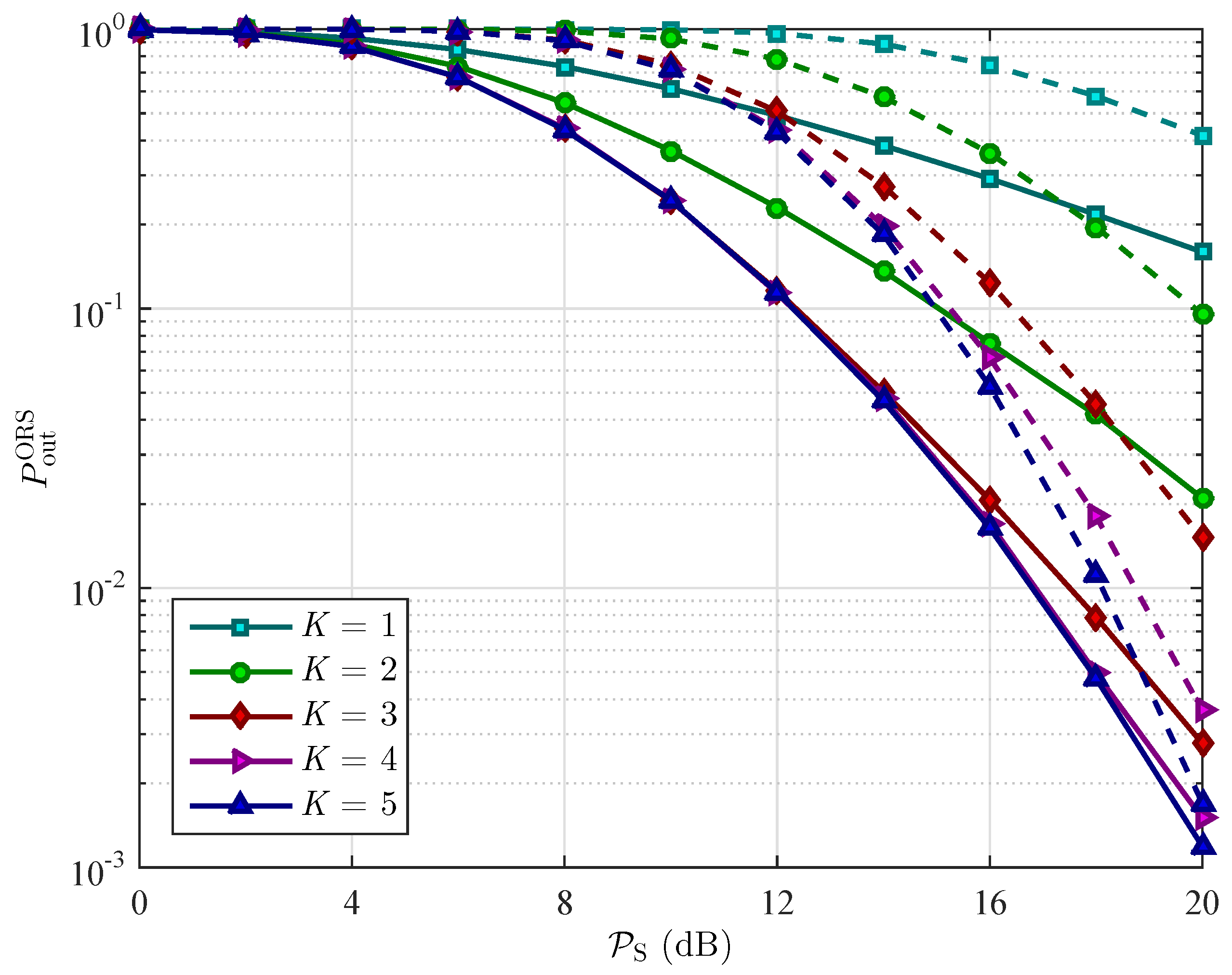 Outage probability of the PRS scheme versus the transmit power of the source for different values of the number of relays K with , and bits/s/Hz. The solid lines represent the OP of the ORS scheme in wireless energy harvesting cooperative networks. The dashed lines represent the OP of the ORS scheme in conventional cooperative networks.