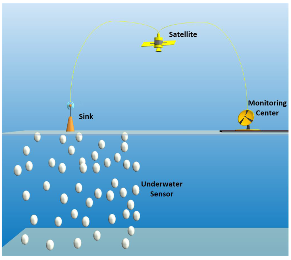 In contrast to the terrestrial networks in which the network topology is simplified into a 2D one, an underwater sensor network has a 3D network topology. In our underwater acoustic sensor network model, a single sink is considered on the water surface, which is equipped with an acoustic modem for underwater communication and a radio modem for out of water communication with the monitoring centre [