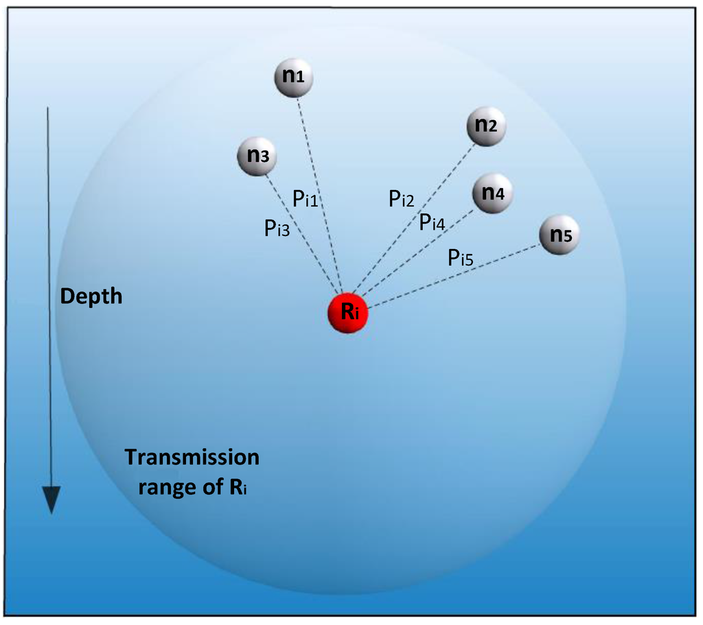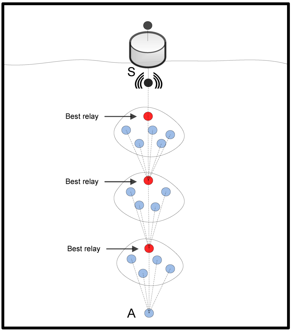 28]. Anchored nodes are located at the bottom of the ocean in the predetermined locations to collect the information and deliver it to the sink by using the relay nodes, which are located at different levels in between [