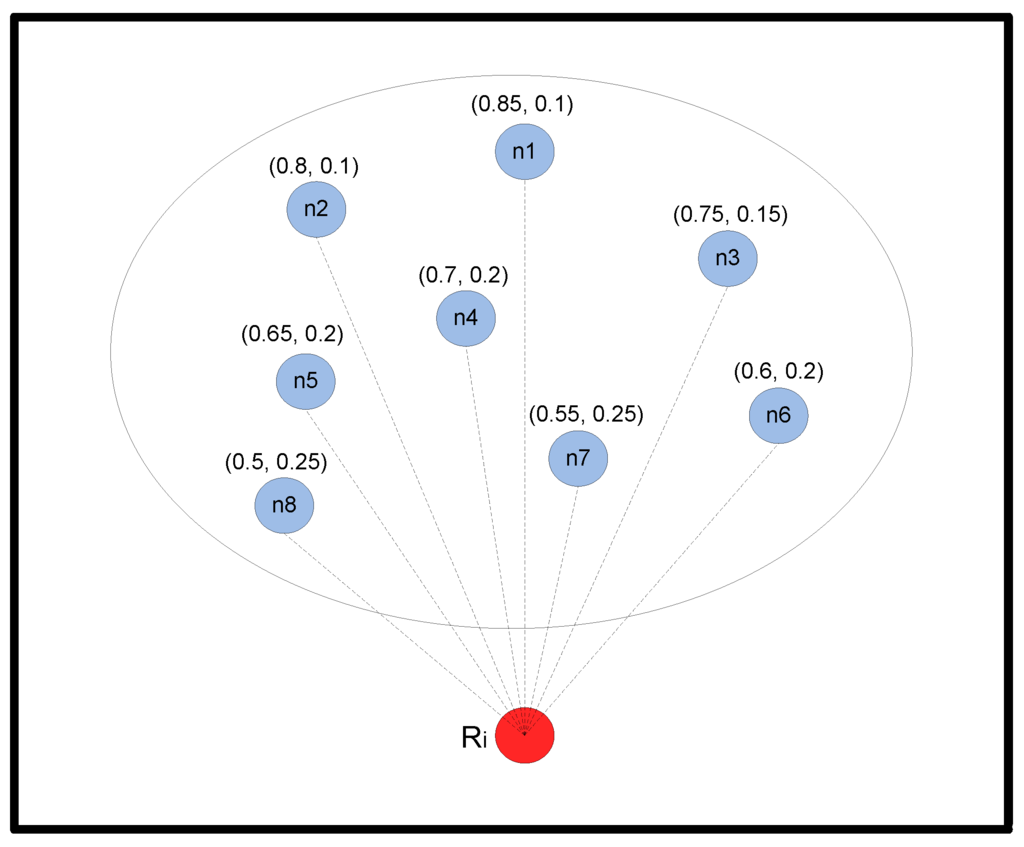The forwarding set should be checked for different numbers of members to achieve the maximum possible value for EEPA. This can be done by examining EEPA for and, finally, picking the set with the largest value and, accordingly, removing other extra nodes from the forwarding set, if required. In this way, we start from an empty set and add nodes (ordered by their advancement) to the forwarding set one by one. Eventually, the optimal set is selected to relay the packet. In a sparse network, all nodes are held in the forwarding set to increase the reliability; however, in a dense network, some nodes are removed to control the energy dissipation.