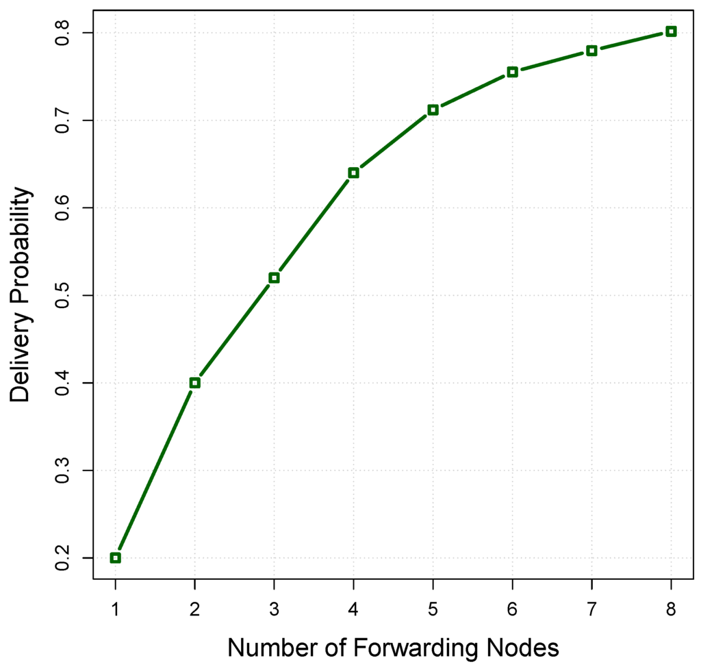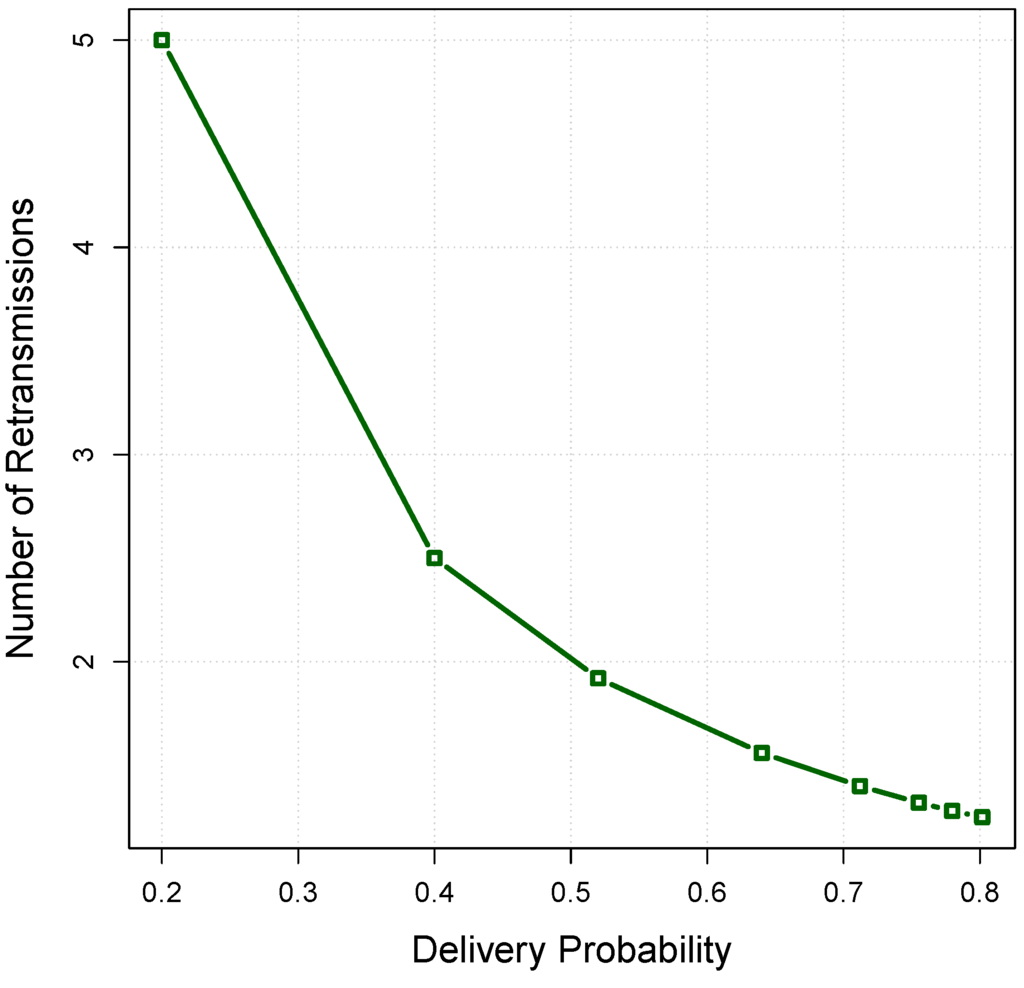 Figure 7 shows the relationship between the number of retransmissions and the delivery probability obtained from